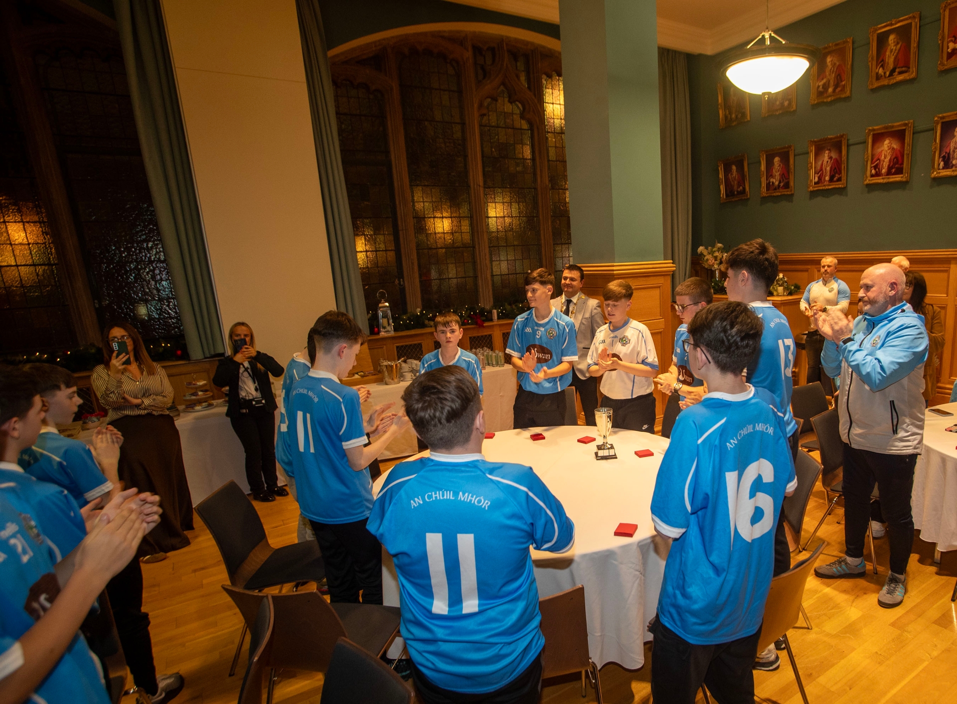 Players and officials of Culmore Cu Chulainns hold a round of applause for the Mayor, Ruairi McHugh on Wednesday evening at the Guldhall.