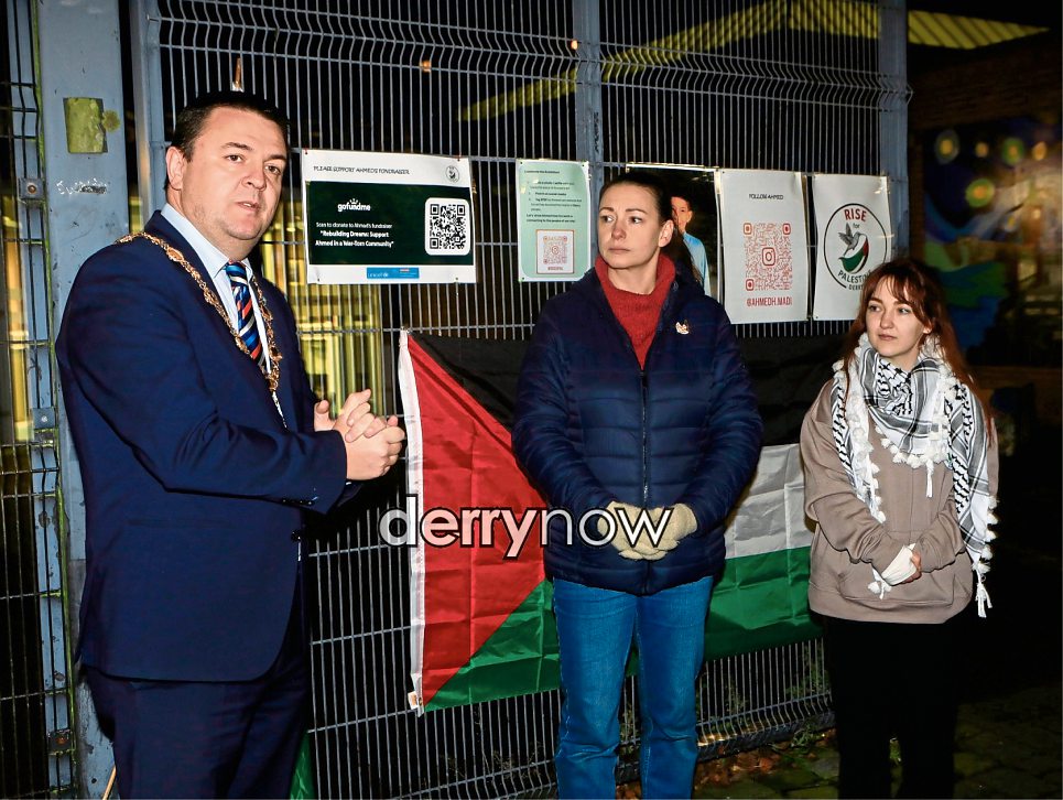 Mayor Ruairí McHugh speaking at the launch of an art exhibition by Ahmed Madi, a 12 year old artist who has documented his life from the heart of Gaza. His artwork is on display outside Pilot's Row. Included are from right Eimear Friel and Lucia McCallion (speakers). (Photos - Tom Heaney, nwpresspics)