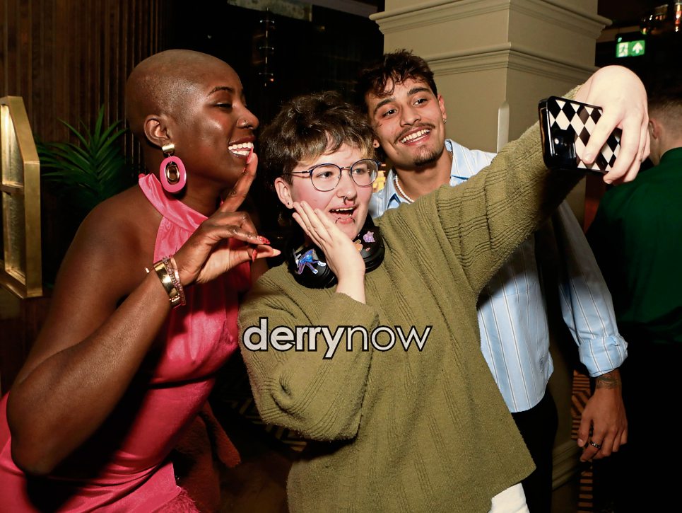 Big Brother contestants Feyisola and Zelah have a "selfie" taken with Evan at the Walled City Hotel. (Photos - Tom Heaney, nwpresspics)