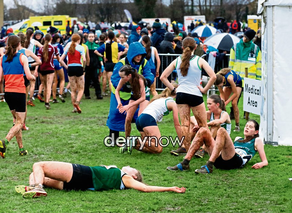 Young girls fall to the ground after crossing the finish line in the U16 race at the National Juvenile Even Age Cross Country Championships held at Templemore Sports Complex.