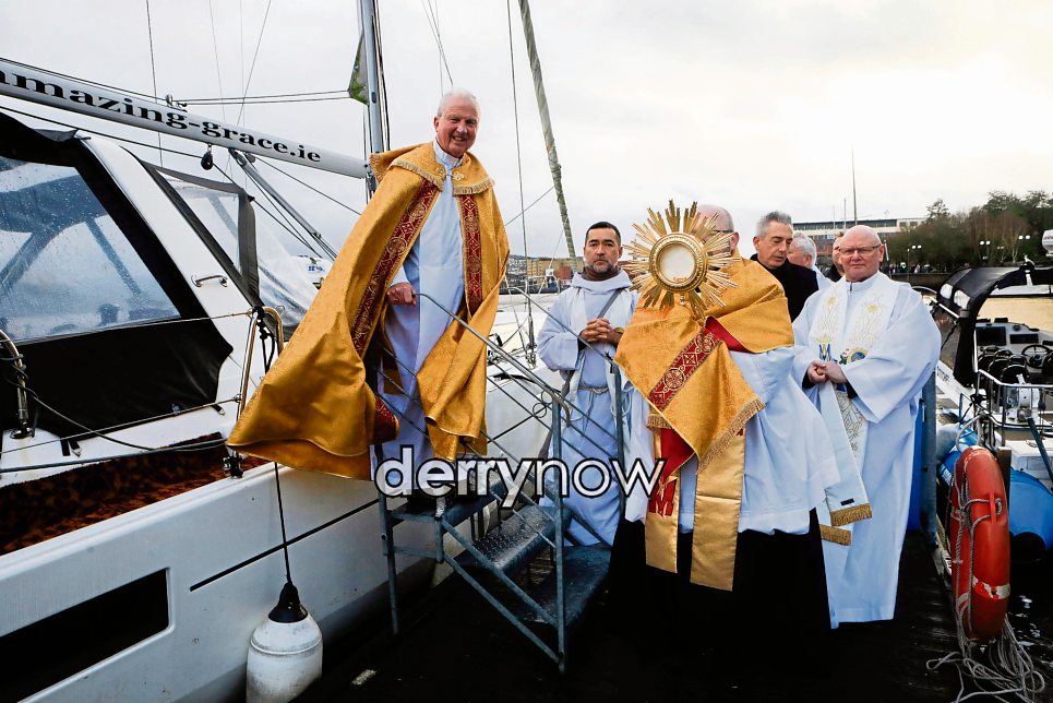 Bishop Donal McKeown pictured fellow clergy before boarding "The Amazing Grace" boat before departing from the jetty to visit the three bridges to commemorate the tree falls of Christ.