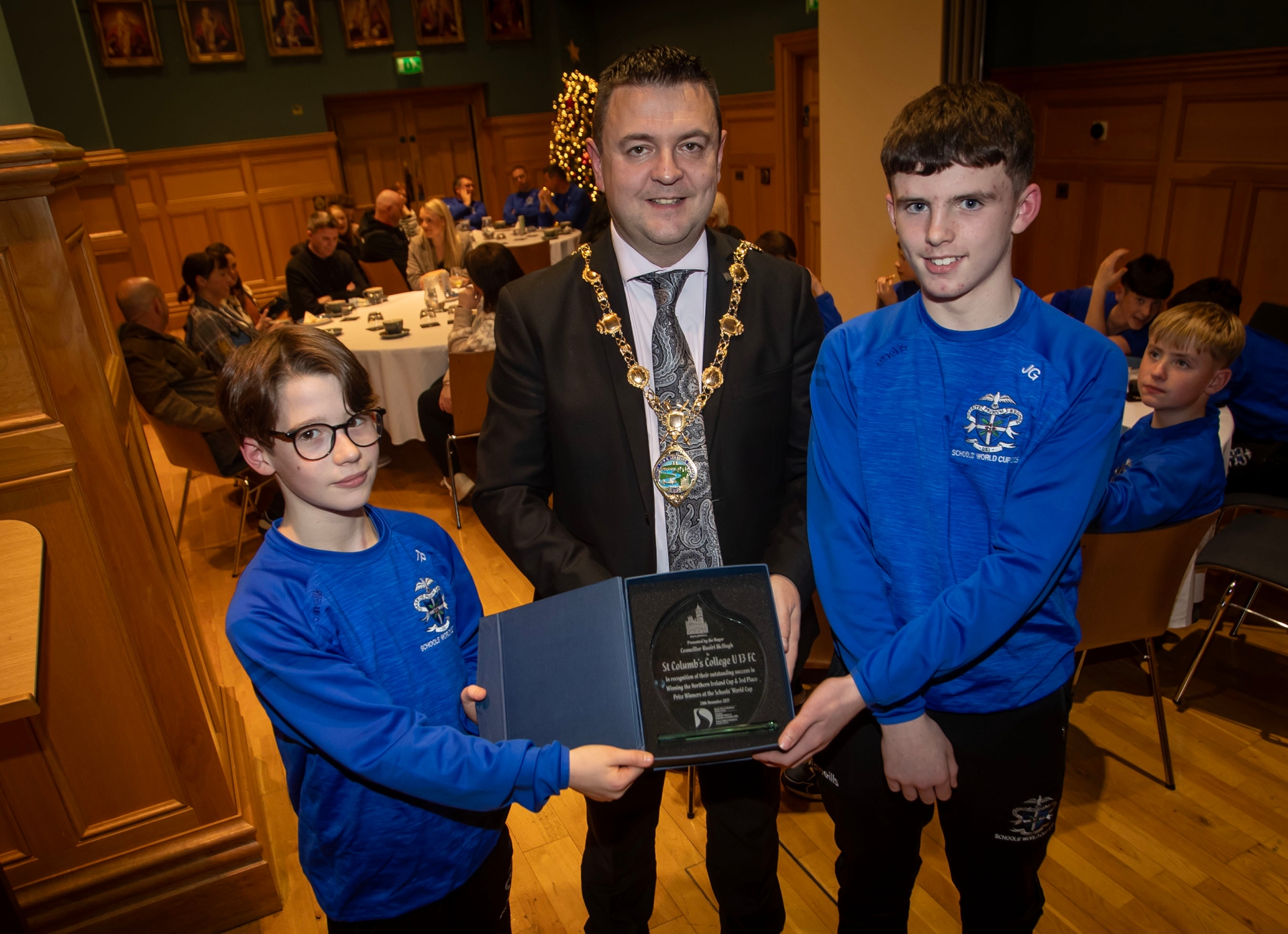 The Mayor of Derry City and Strabane District Council, Ruairi McHugh, making a special presentation to captains Tom Prigent and Joe Gray at Monday evening's reception in honour of the St. Columb's College u-13 football team in recognition of their winning the Northern Ireland Cup and gaining third place in the Schools World Cup held in Spain recently.