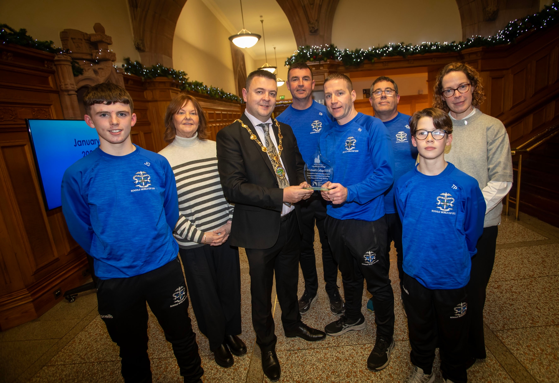 The Mayor, Ruairi McHugh presenting the award to Mr. Ryan Horner, manager, St. Columb's College u-13s at Monday's reception. Included from left are Joe Gray, captain, Ms. Geraldine Cavanavan, board of governors, Eamonn Burns, Xavier Prigent, Tim Prigent, captain and Ms. Ursula Grimley, Vice Principal.