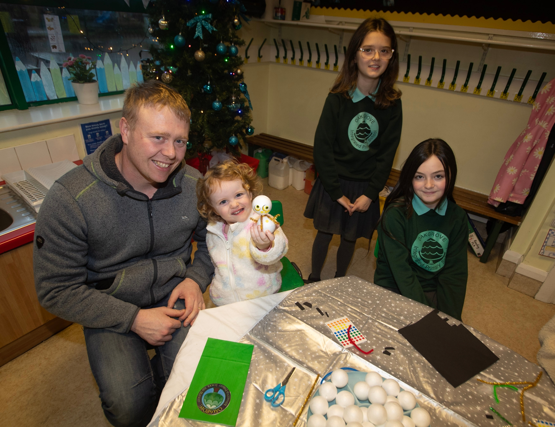 Dad Christopher Ramsey and daughter Abilgail showing off their model at the Oakgrove Integrated Open Day on Thursday. Included are P7 pupils Katie and Eva.