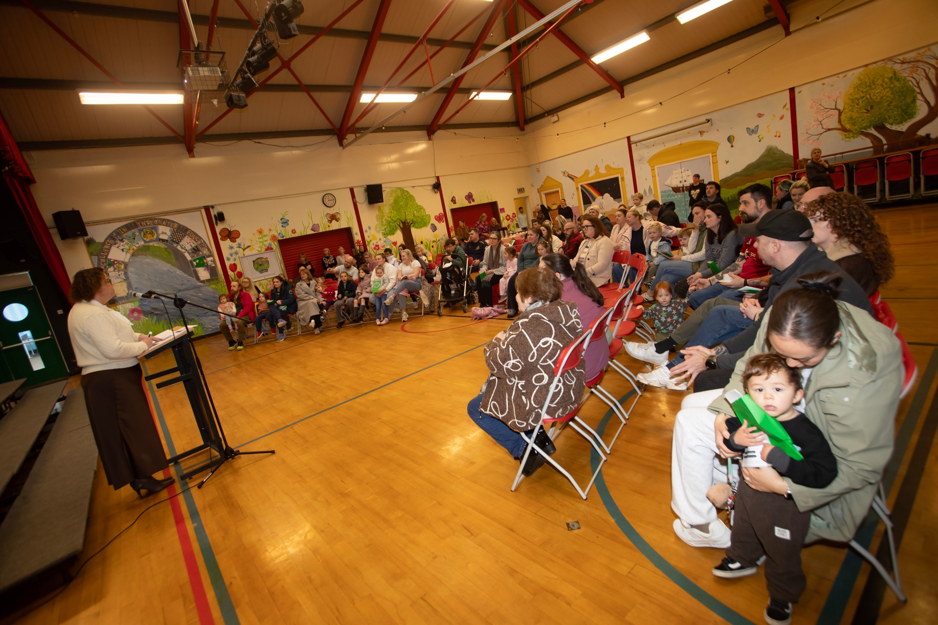Mrs. Ashley Donaghy, Principal, Oakgrove Integrated Primary and Nursery School, pictured addressing parents and prospective pupils at the Annual Open Day on Thursday last.