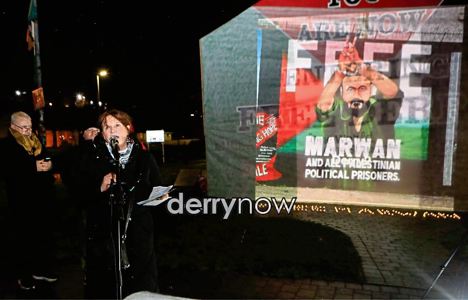 Patricia Campbell speaking at the Five For Palestine Rally at Free Derry Corner to coincide with the official launch of the Free Marwan Barghouti campaign.
