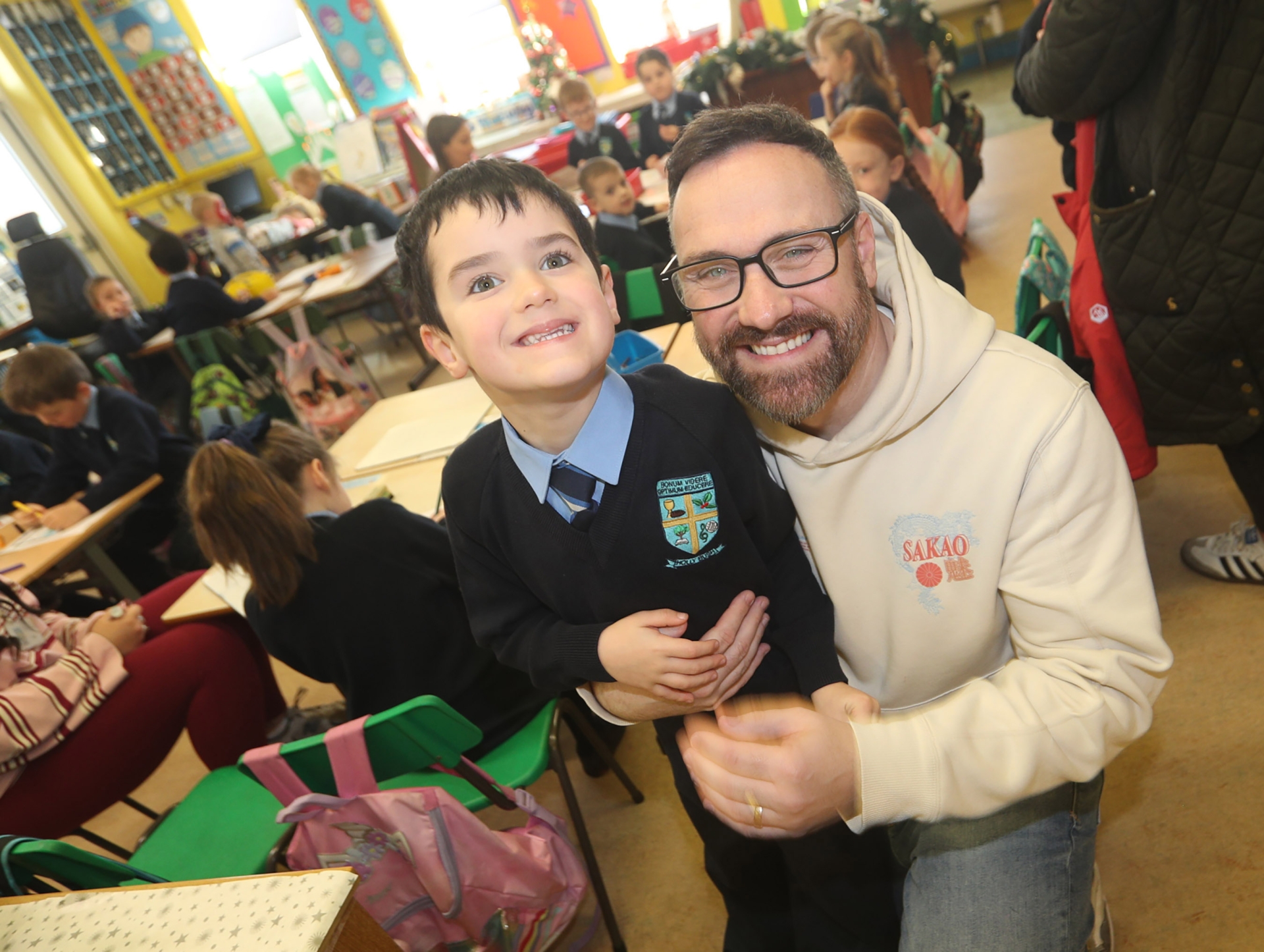 Parent Mark Haslett meets his nephew Zac during Open Day at Hollybush on Tuesday.