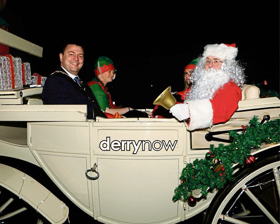 Mayor Ruairí McHugh arriving on a horse drawn carriage with Santa and his elves at Enagh Crescent to switch on the Christmas tree lights. (Photos - Tom Heaney, nwpresspics)
