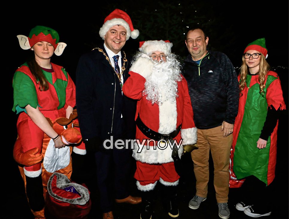 Mayor Ruairí McHugh and Colr. Declan Norris with Santa and his elves at Enagh Crescent switch on the Christmas tree lights.