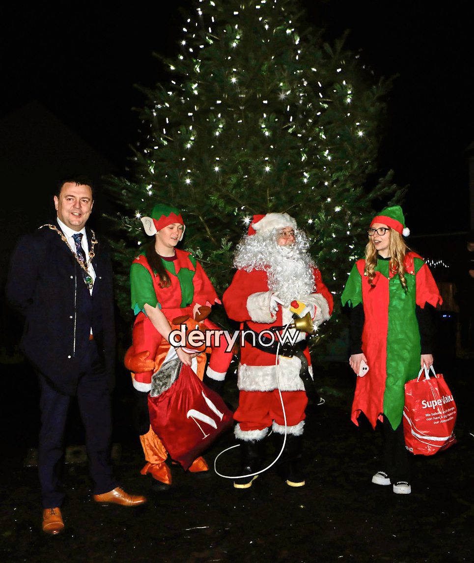 Mayor Ruairí McHugh with Santa and his elves at Enagh Crescent at the switch on the Christmas tree lights.