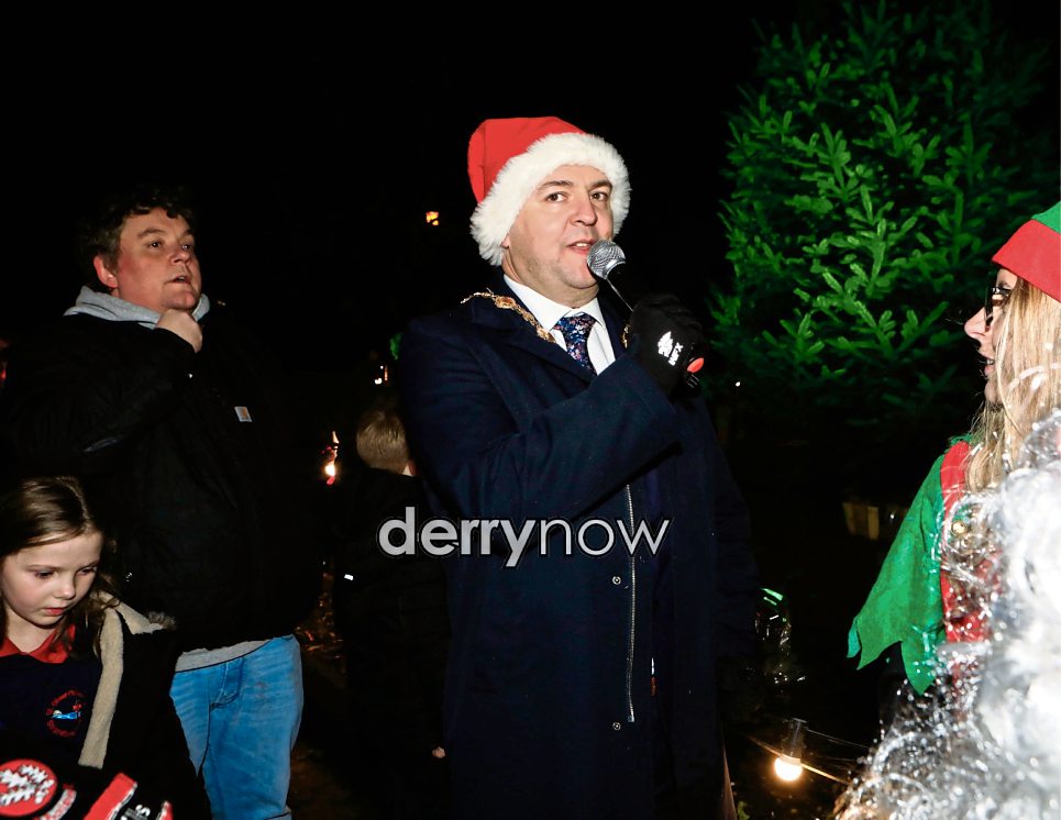 Mayor Ruairí McHugh speaking at the switch on the Christmas tree lights at Strathfoyle Youth Forum.