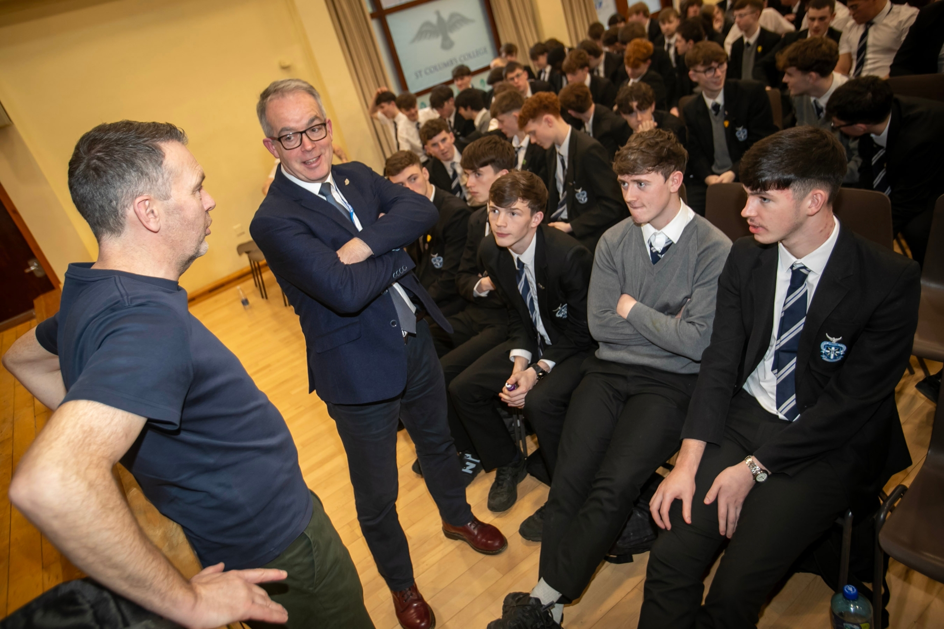 Mr. Tony McGonigle and Year 14 students in conversation with Oisin McConville at Wednesday's event in St. Columb's College.