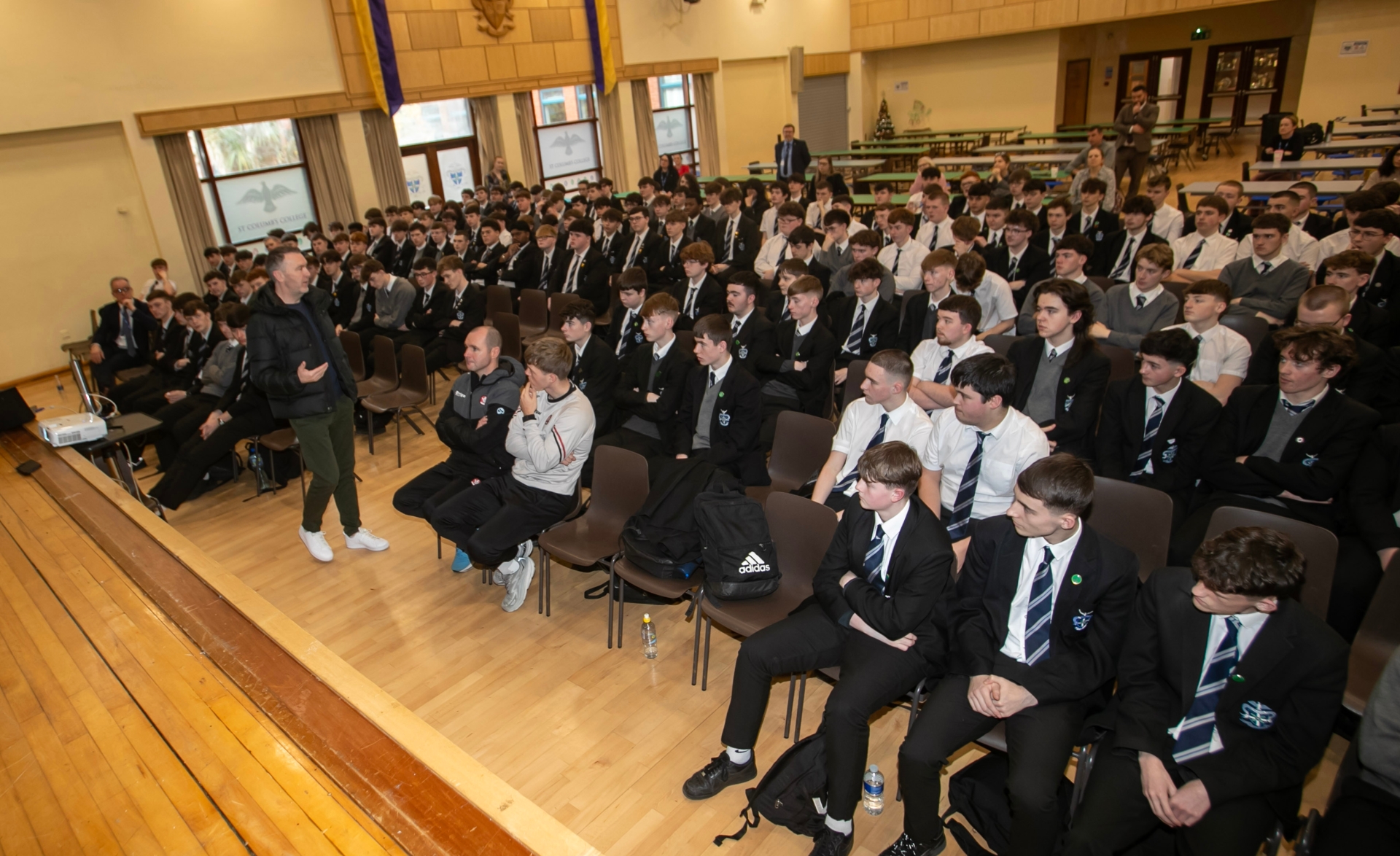 Oisin McConville, former Armagh GAA star addressing students at St. Columb's College.