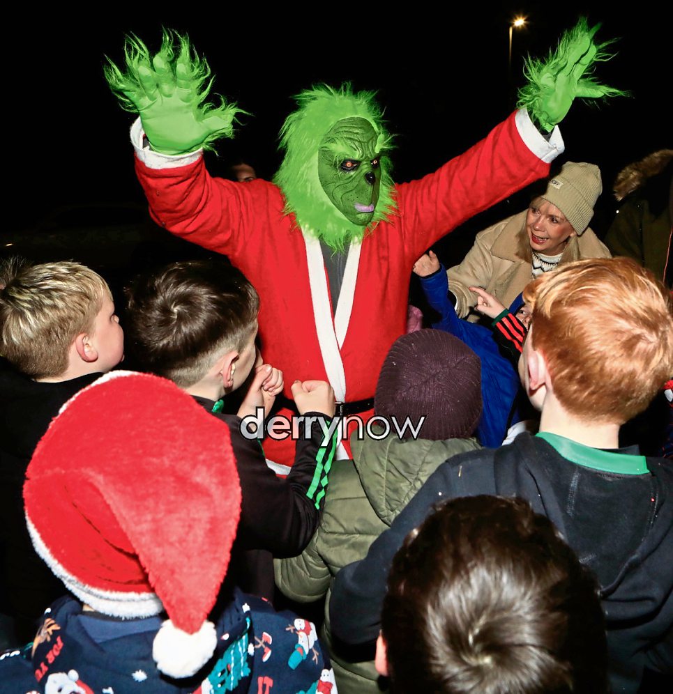 The Grinch arriving at the Greysteel Christmas tree lights switch on.