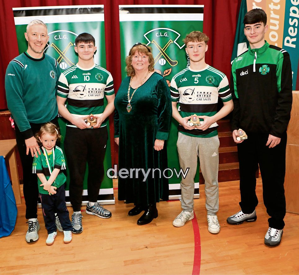 Deputy Mayor Niree McMorris making a presentation to at the Na Magha end of year prizegiving to County hurling reps, Joe Bryson, Conal McCauley and Callum Mackey Richardson. Included is club chairperson, Breandán Óg Quigley with his daughter Nora.