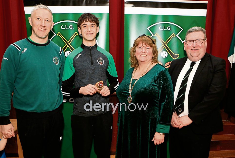 Deputy Mayor Niree McMorris who made a presentation to County Minor Hurler Cathal McNicholl at the Na Magha end of year prizegiving. Included is club chairperson, Breandán Óg Quigley and on right club president David Flood.