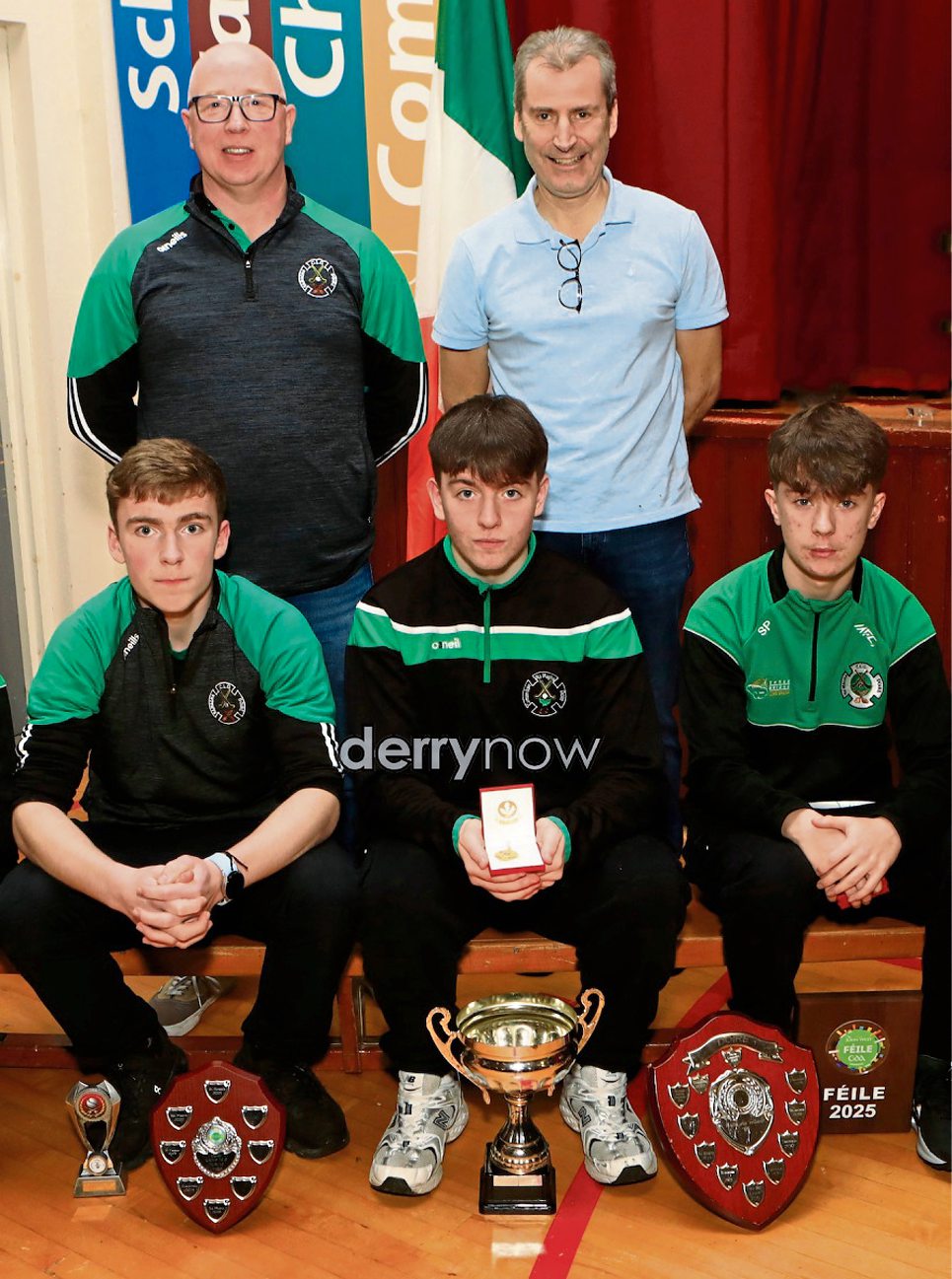 Group pictured at the Na Magha end of the year prize giving. Seated, from left, are U14 captain Ronan Matthews, U15 captain Sean Plummer, and U16 captain Shea Omora. Standing are coaches Ray Monagan and Gerry Matthews. (Photos - Tom Heaney, nwpresspics)