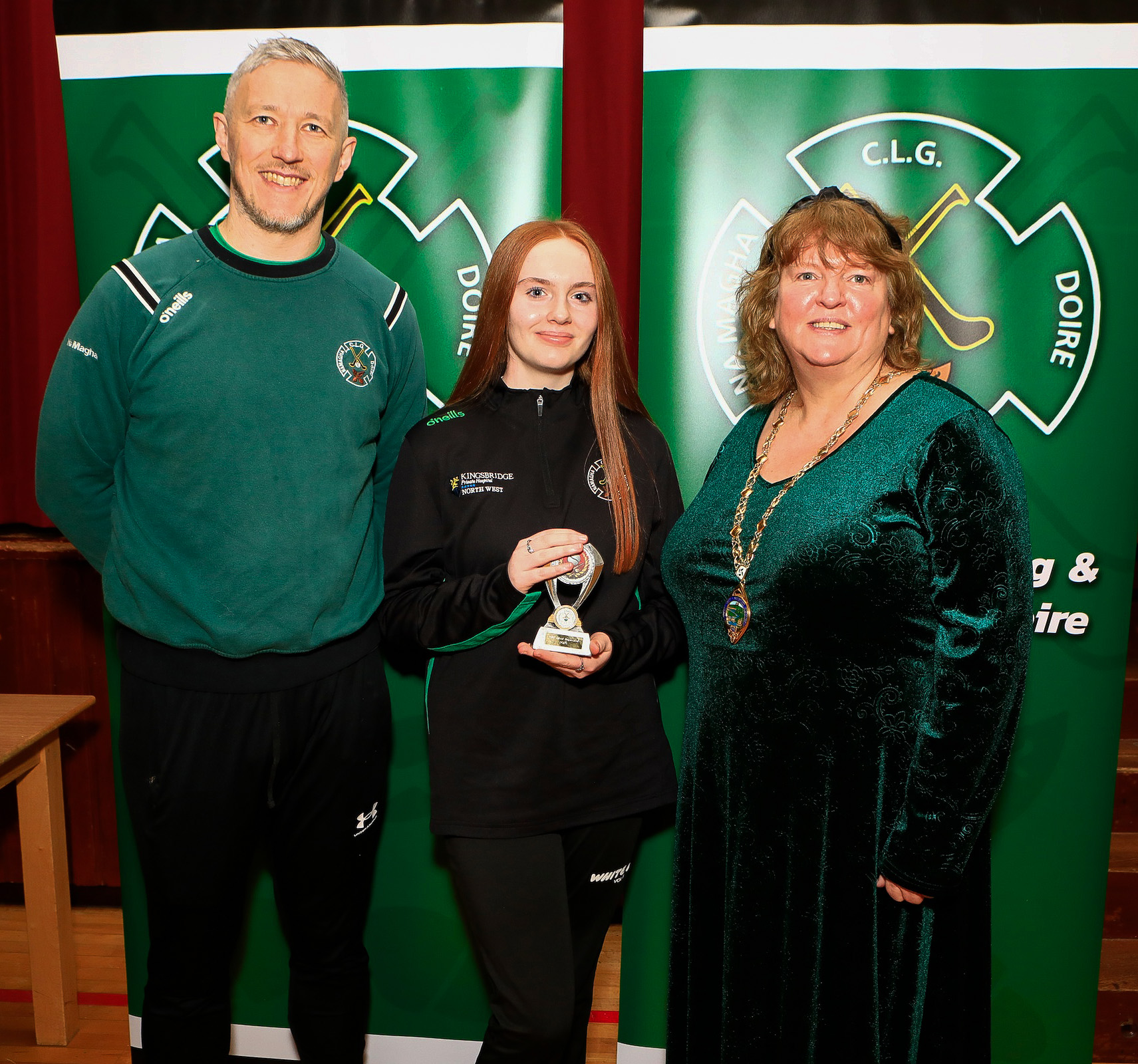 Deputy Mayor Niree McMorris making a presentation to Clodagh Omora Most Improved Camogie player at the Na Magha end of year prizegiving. Included is club chairperson, Breandán Óg Quigley.