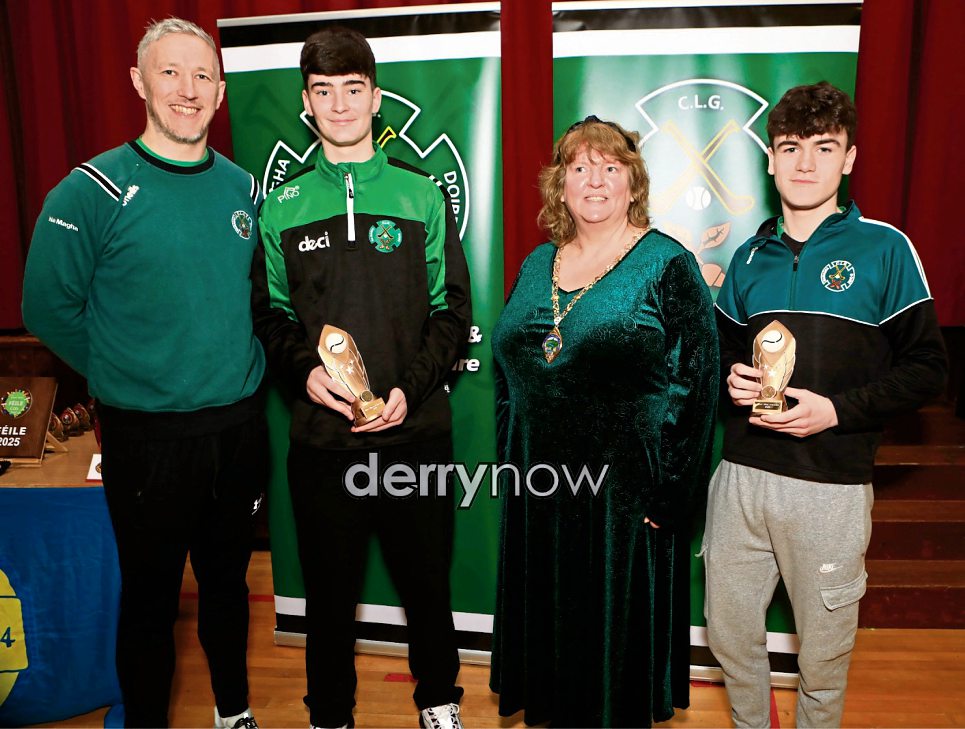 Deputy Mayor Niree McMorris making a presentation at the Na Magha end of year prize giving held in St. Brigid's College. Included are club chairperson, Breandán Óg Quigley, Minor Hurlers, Hugh O'Connor, Player of the Year, and Callum Mackey Richardson, Most Improved Player of the Year.