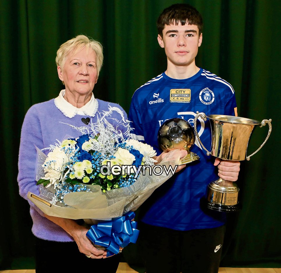 Collette Ballard who presented the Ronnie Ballard Award for the Overall Player of the Year to John Anthony Deane at Trojans annual presentation of awards held in Cecilia's College. (Photos - Tom Heaney, nwpresspics)
