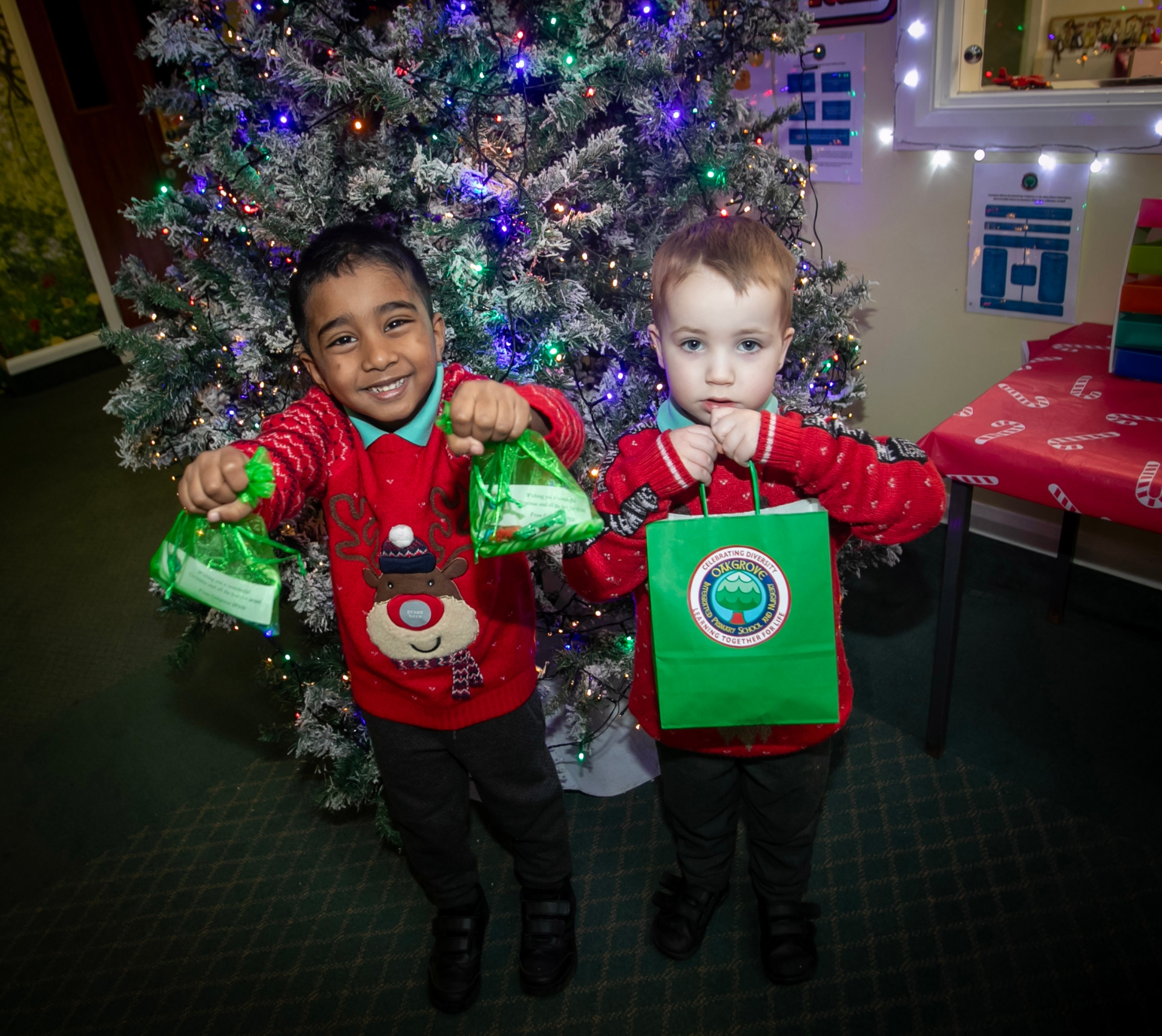 Primary 1 pupils Aden and Elliot pictured beside the Christmas tree before embarking on their Christmas Kindness Walk on Thursday at Oakgrove Integrated Primary School and Nursery. (Photos: Jim McCafferty Photography)
