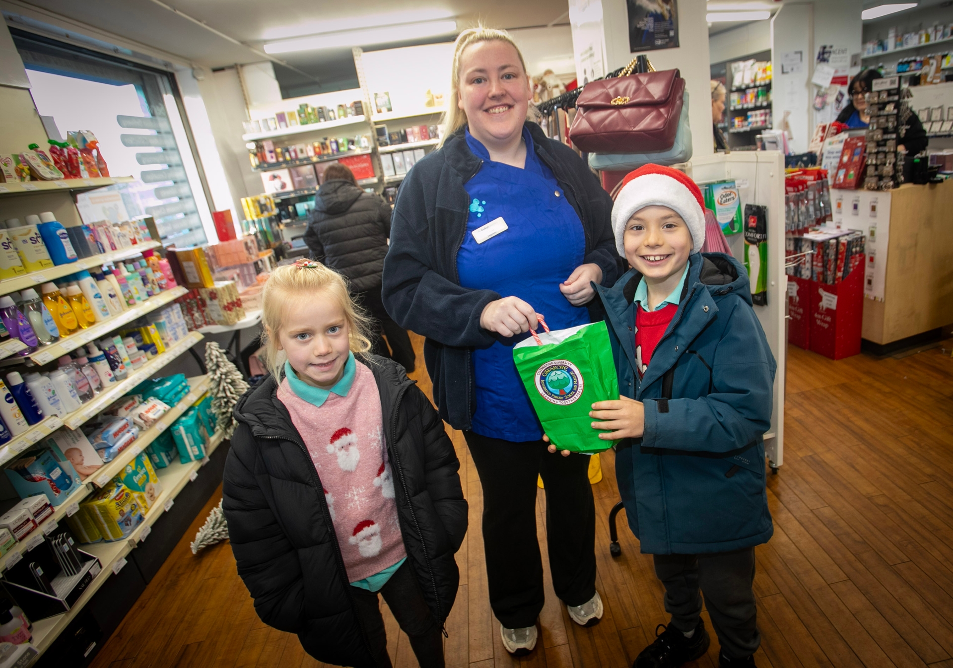 Oakgrove IPSN pupils Aine and Alexander calling into one of the local businesses to add Christmas cheer on Thursday.