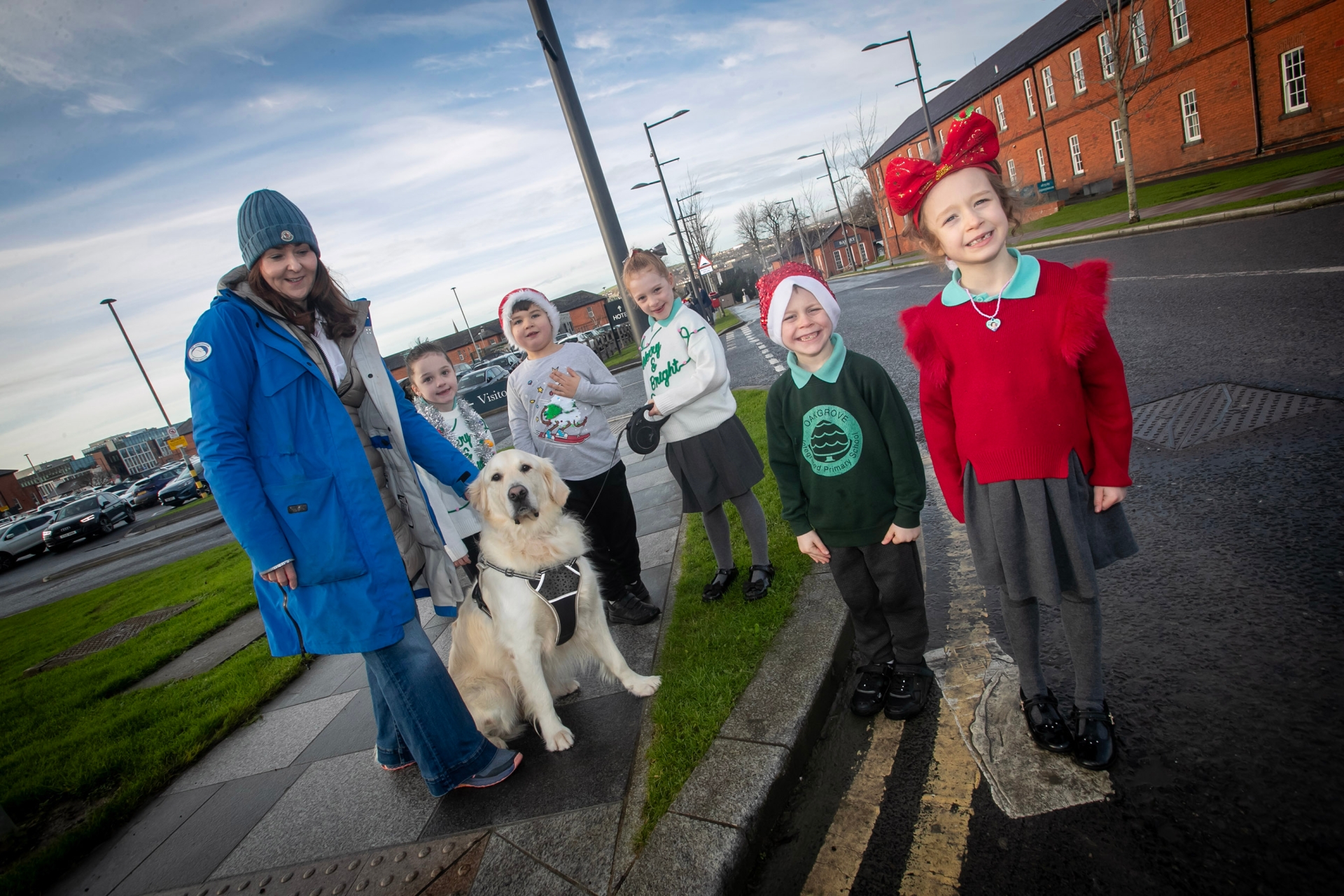 'Olso' stops for a picture with Oakgrove pupils Olivia, Charlie, Roise, Jacob, Alice on Thursday at Ebrington Square.