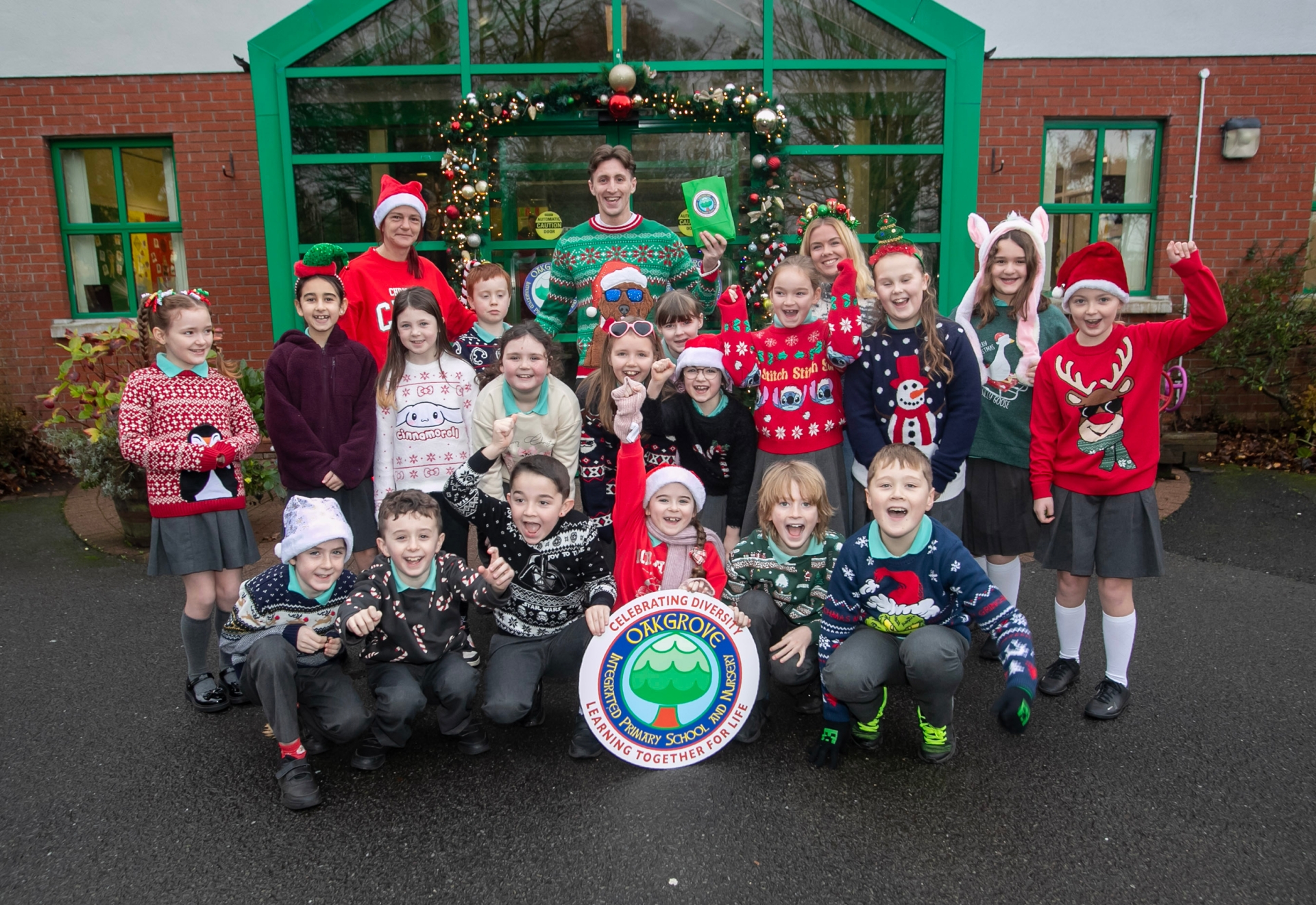 Oakgrove's Primary 5 class with Mr. Patton pictured before embarking on their Christmas Kindness Walk on Thursday at Oakgrove Integrated Primary School and Nursery.