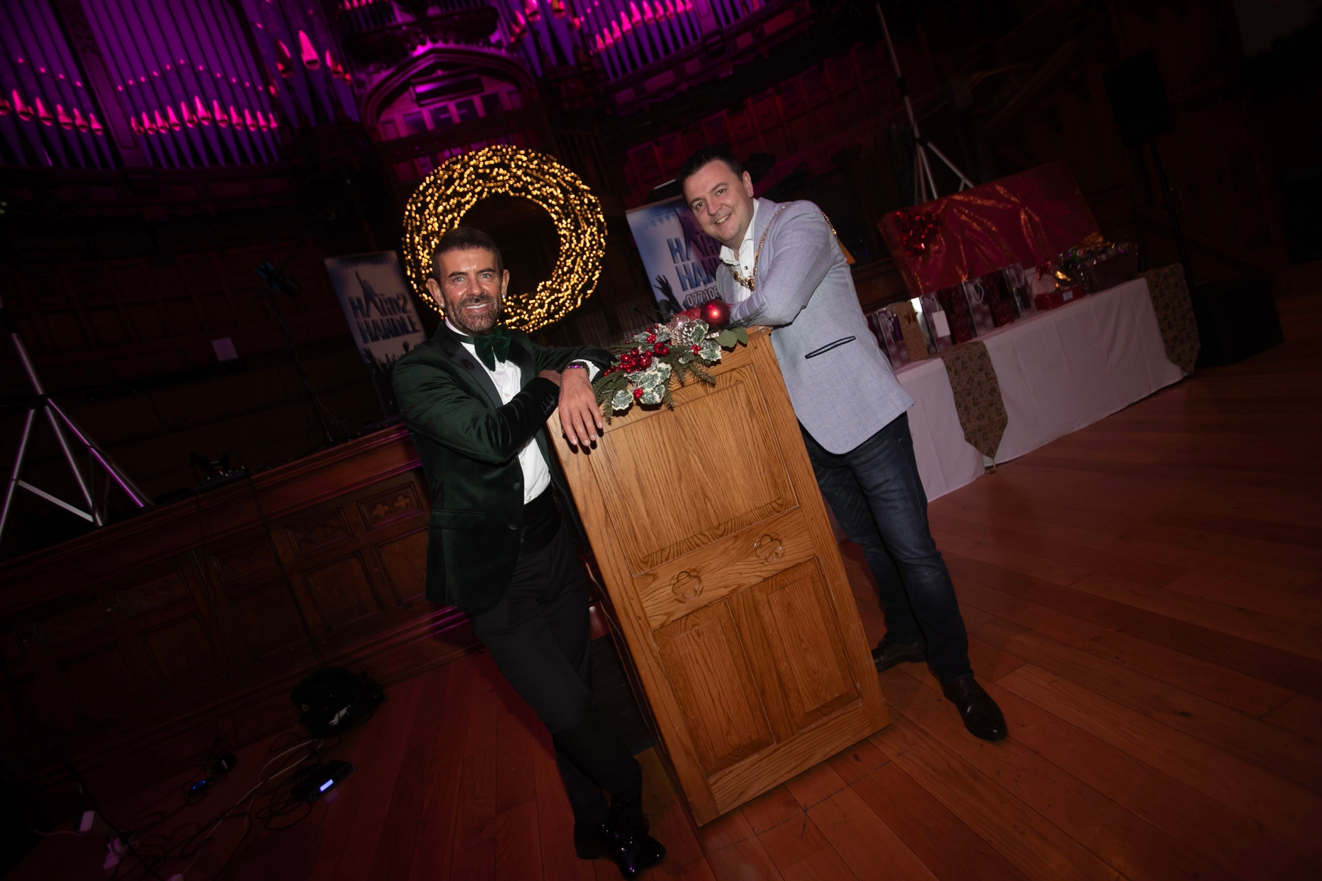 The Mayor, Ruairi McHugh pictured with host Micky Doherty at Friday night's Gala Charity Christmas Ball in the Guildhall in aid of his two charities.