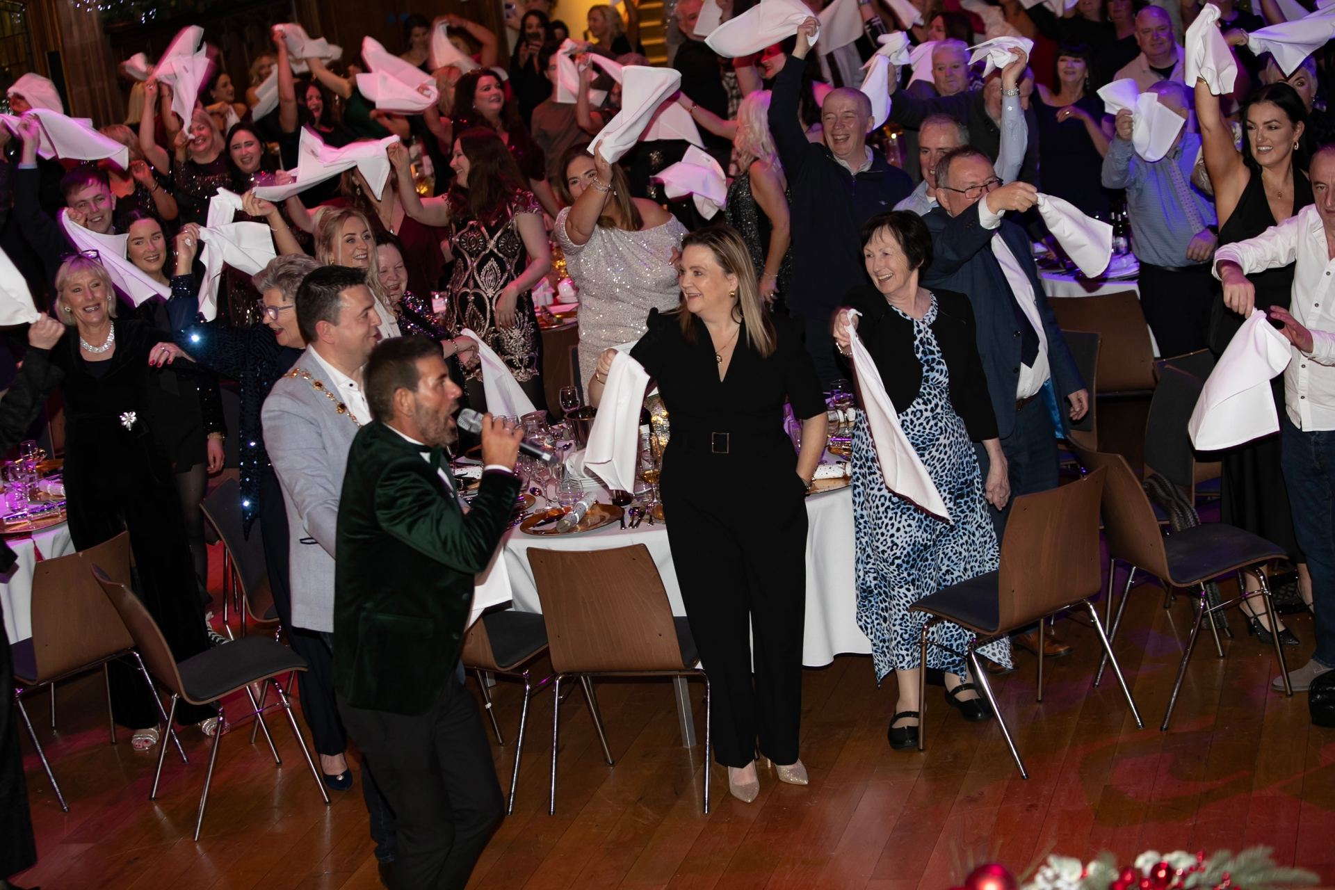 Host Micky Doherty gets everyone into the spirit during Friday night's Charity Christmas Ball in the Guildhall, Derry.