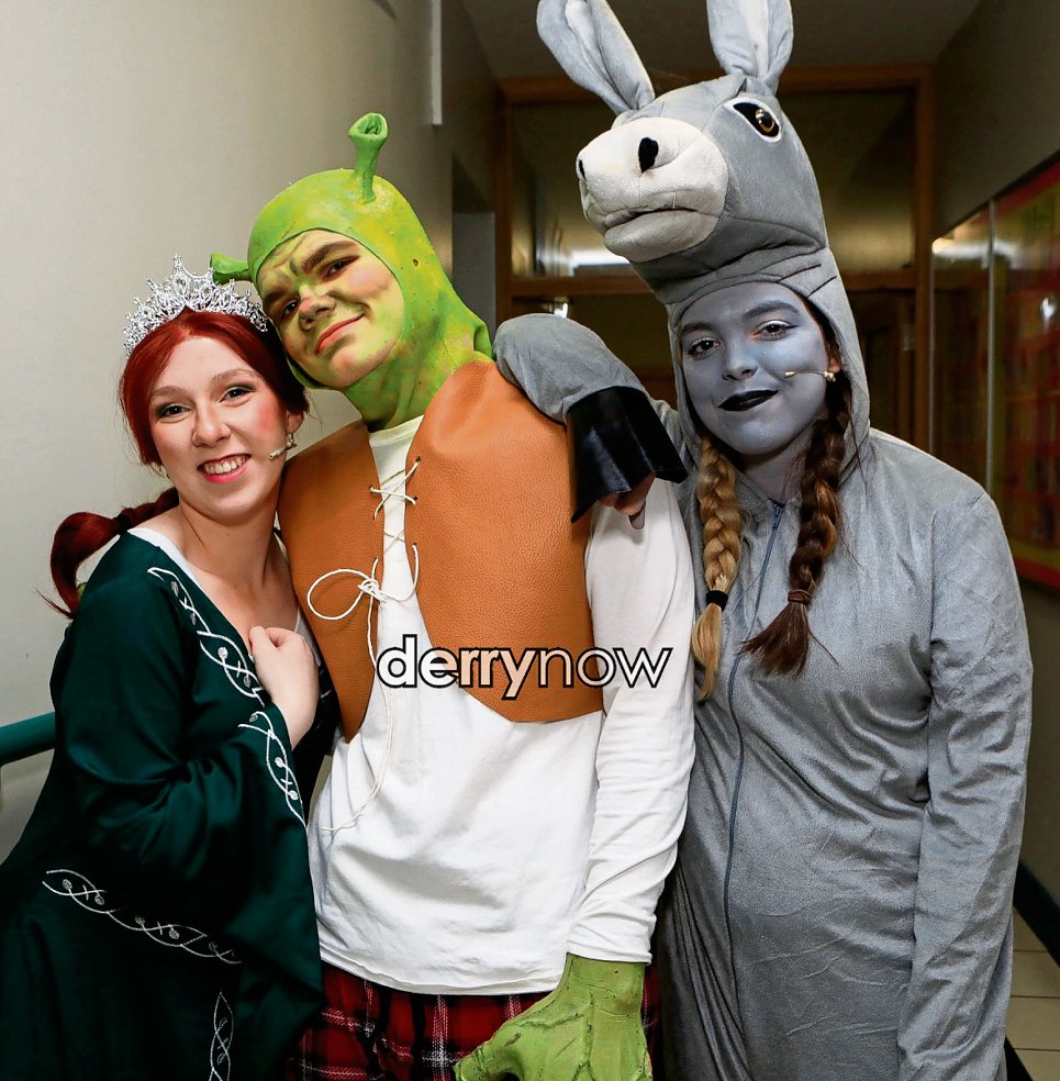 Owen Donaghy is "Shrek" with Erin O'Kane "Fiona" and Erin O'Donnell "Donkey" in St. Patrick's & St. Brigid's College's production of Dreamworks "Shrek The Musical". (Photos - Tom Heaney, nwpresspics)