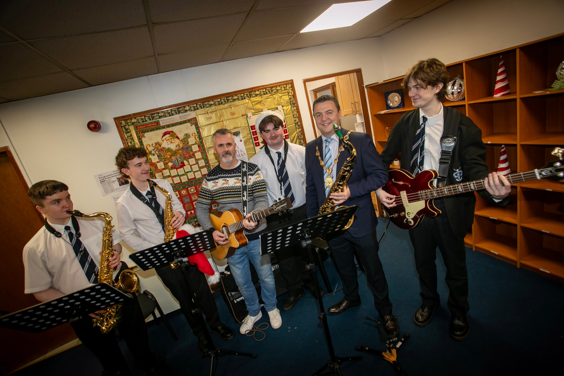 The Mayor Ruairi McHugh and Rory McPartland, GSAP manager join in a few festive tunes with the young band from St. Columb's College during Friday's networking event. (Photos: Jim McCafferty Photography)
