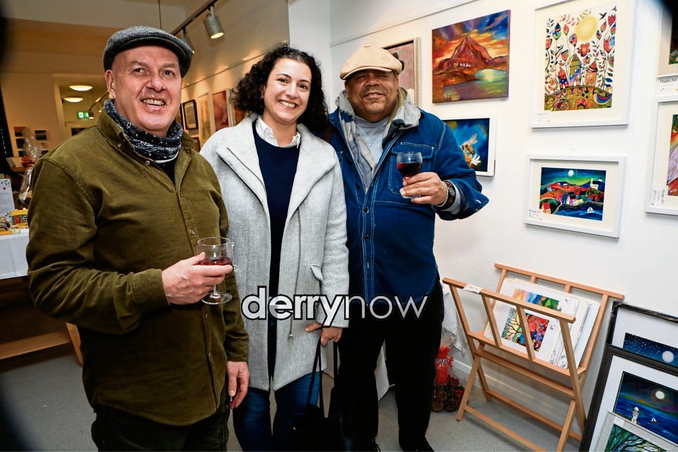 Local artist Paul Campbell with Eric and Jessica Ward at the Rathmullan Makers Market-UV Arts C.I.C held in the Garden of Reflection Gallery and will run until December 21. (Photos - Tom Heaney, nwpresspics)