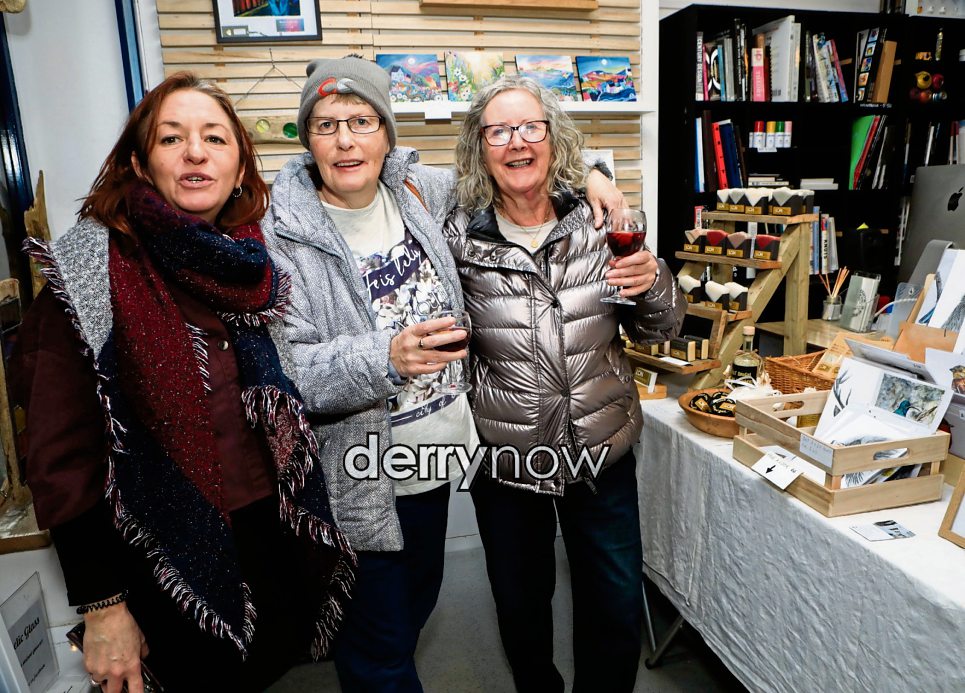 Claire Heaney, co-ordinator, with Marie O'Callaghan and Frances Beagan at the Rathmullan Makers Market-UV Arts C.I.C held in the Garden of Reflection Gallery.