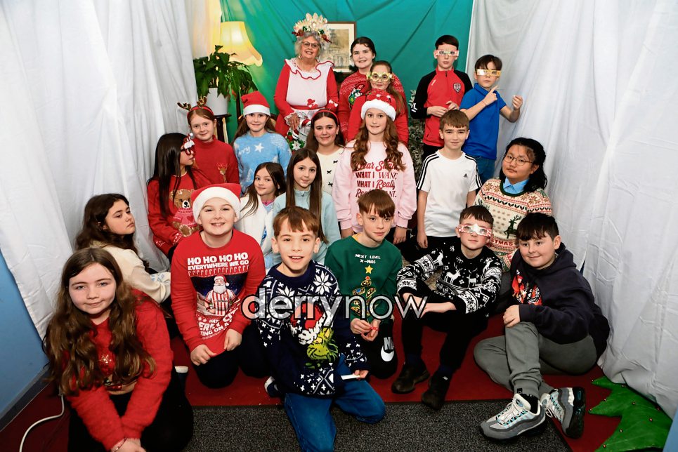 Mrs. Clause with P7 pupils at St. Eithne's PS at the Special School and Community Santa Celebration held in the school's assembly hall.