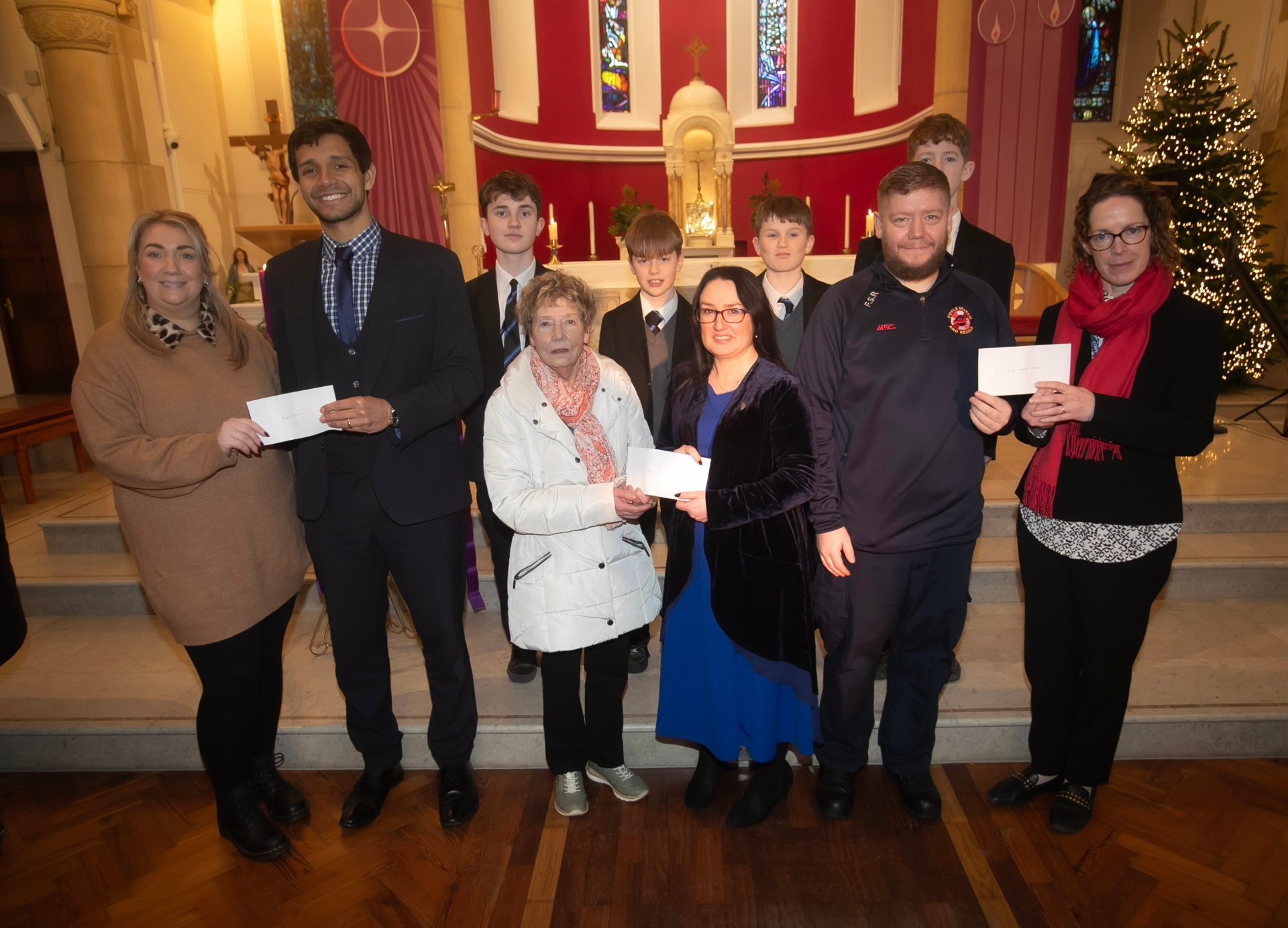 Mrs. Caroline McLaughlin, Principal, St. Columb's College pictured with staff and students handing over cheques to this year's charities - Foyle Hospice, St. Vincent de Paul and Foyle Search and Rescue.