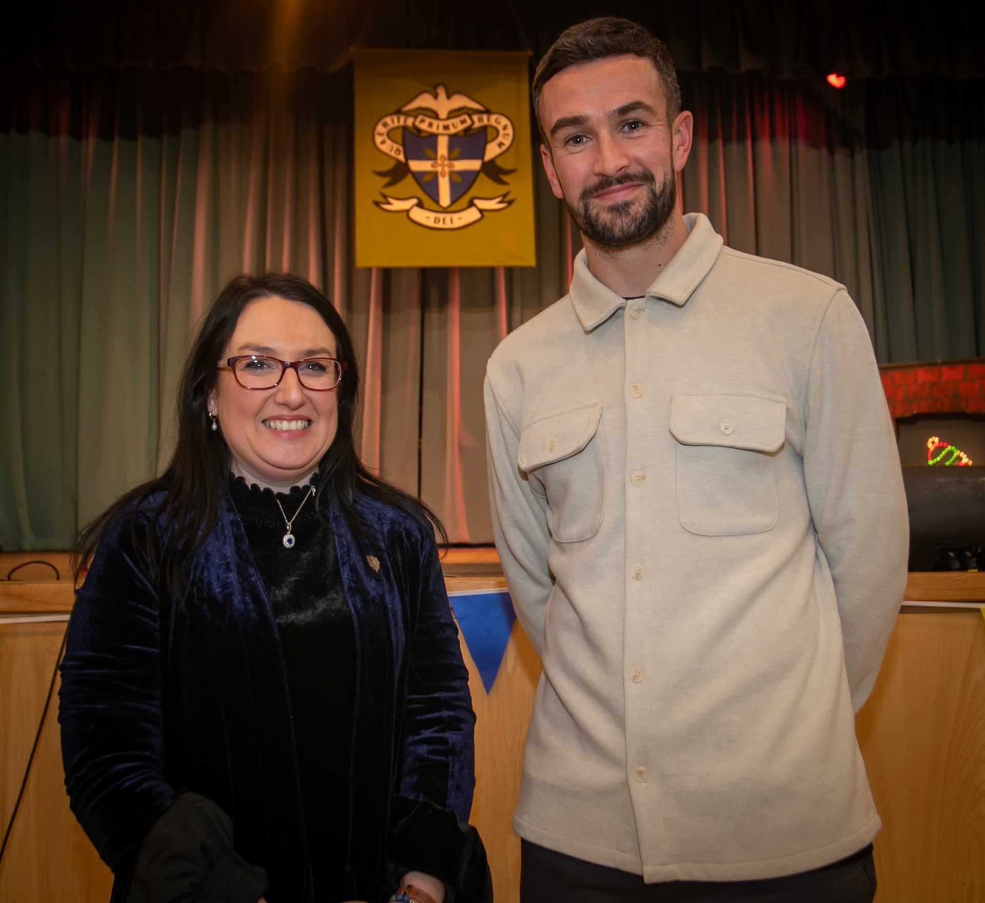 St. Columb's College Principal, Mrs. Caroline McLaughlin welcoming Derry City star and former pupil Michael Duffy back to the college on Wednesday night where he was a judge in the 'St. Columb's Got Talent' show.