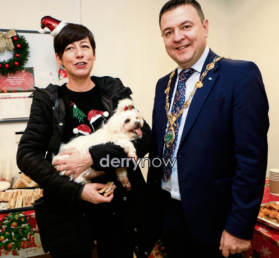 Mayor Ruairí McHugh with Kelly McFeely and her pooch "Lola".