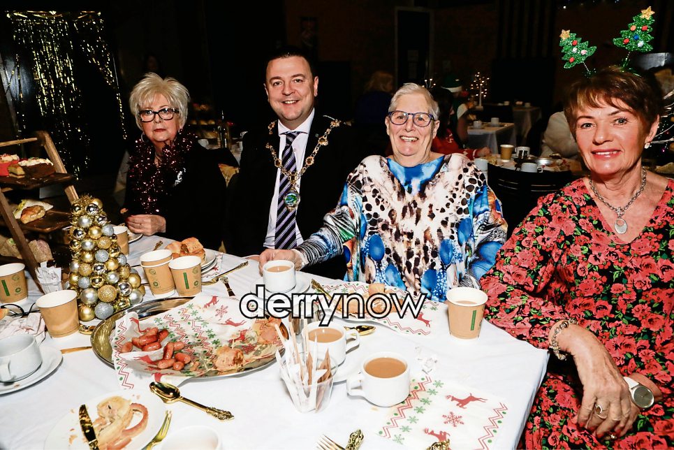 Mayor Ruairí McHugh with Eilish Friel, Dorothy Campbell and Hilary Page at the Stitch in Time Christmas Tea Dance held in An Culturlann. (Photos - Tom Heaney, nwpresspics)