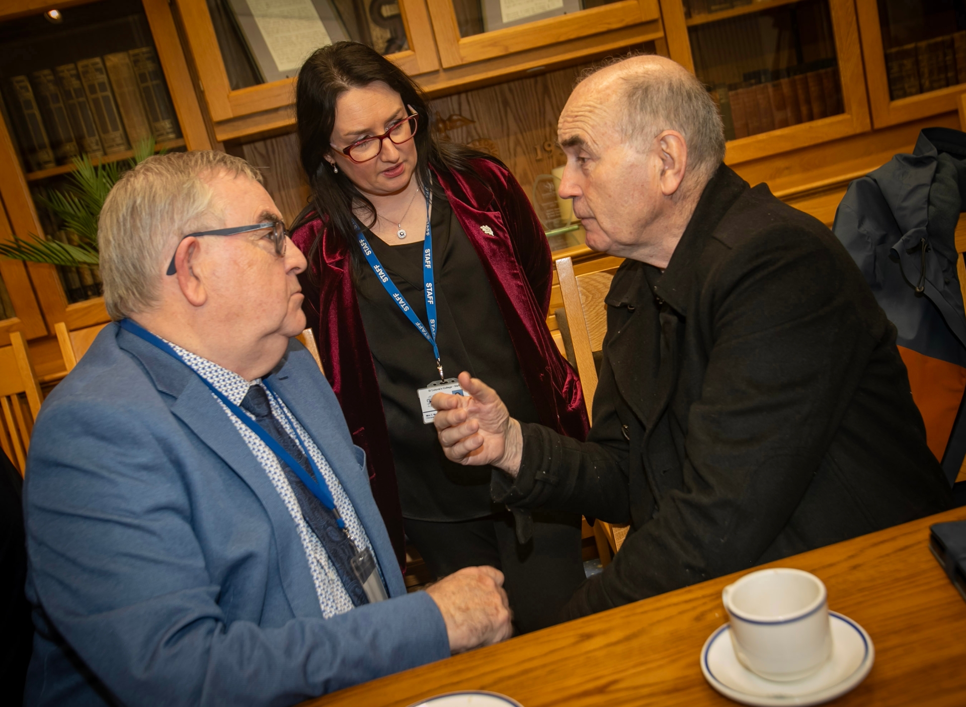 St. Columb's College Principal, Mrs. Caroline McLaughlin in conversation with Sean Bradley and Monsignor Andy Dolan.