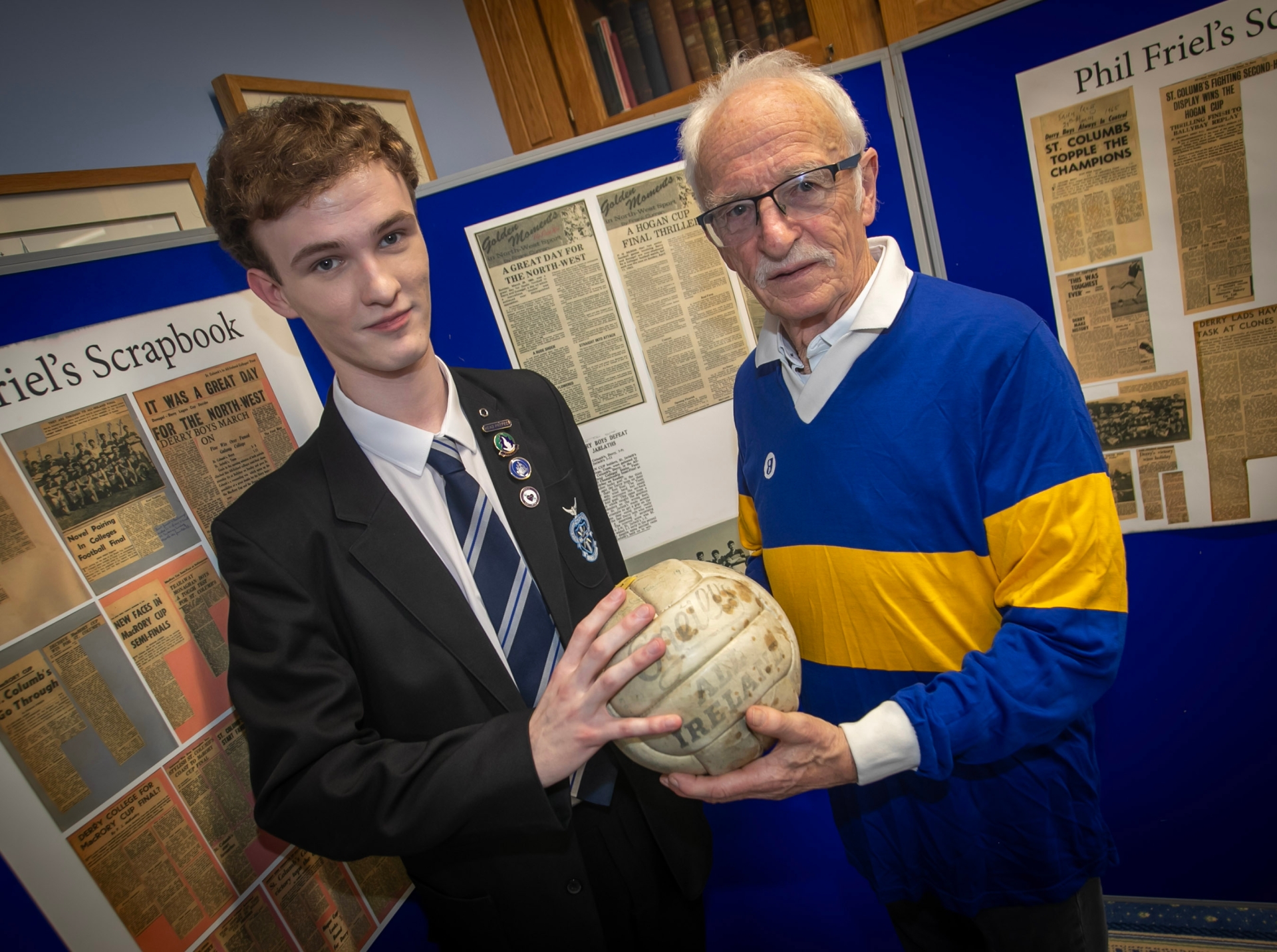 MY HOGAN CUP HERO!. . . . St. Columb's College Head Boy Aaron O'Doherty pictured his grandad Tony and the official ball used in the All-Ireland Schools final - Hogan Cup 1966 final, during Thursday's event. (Photos: Jim McCafferty Photography)