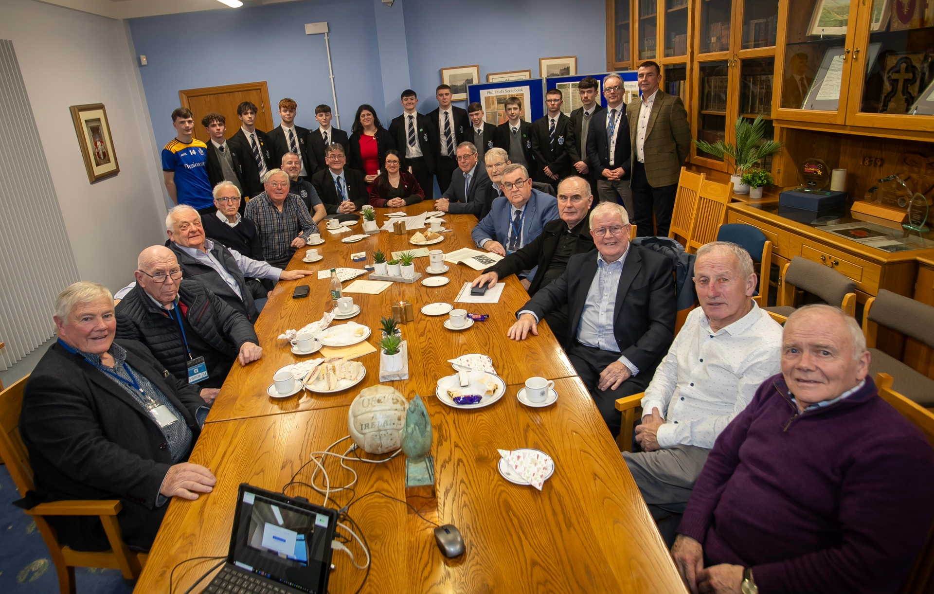 St. Columb's College Principal, staff and students pictured with a number of the famous 1965 Hogan Cup players during their visit to the school on Thursday last. (Photos: Jim McCafferty Photography)