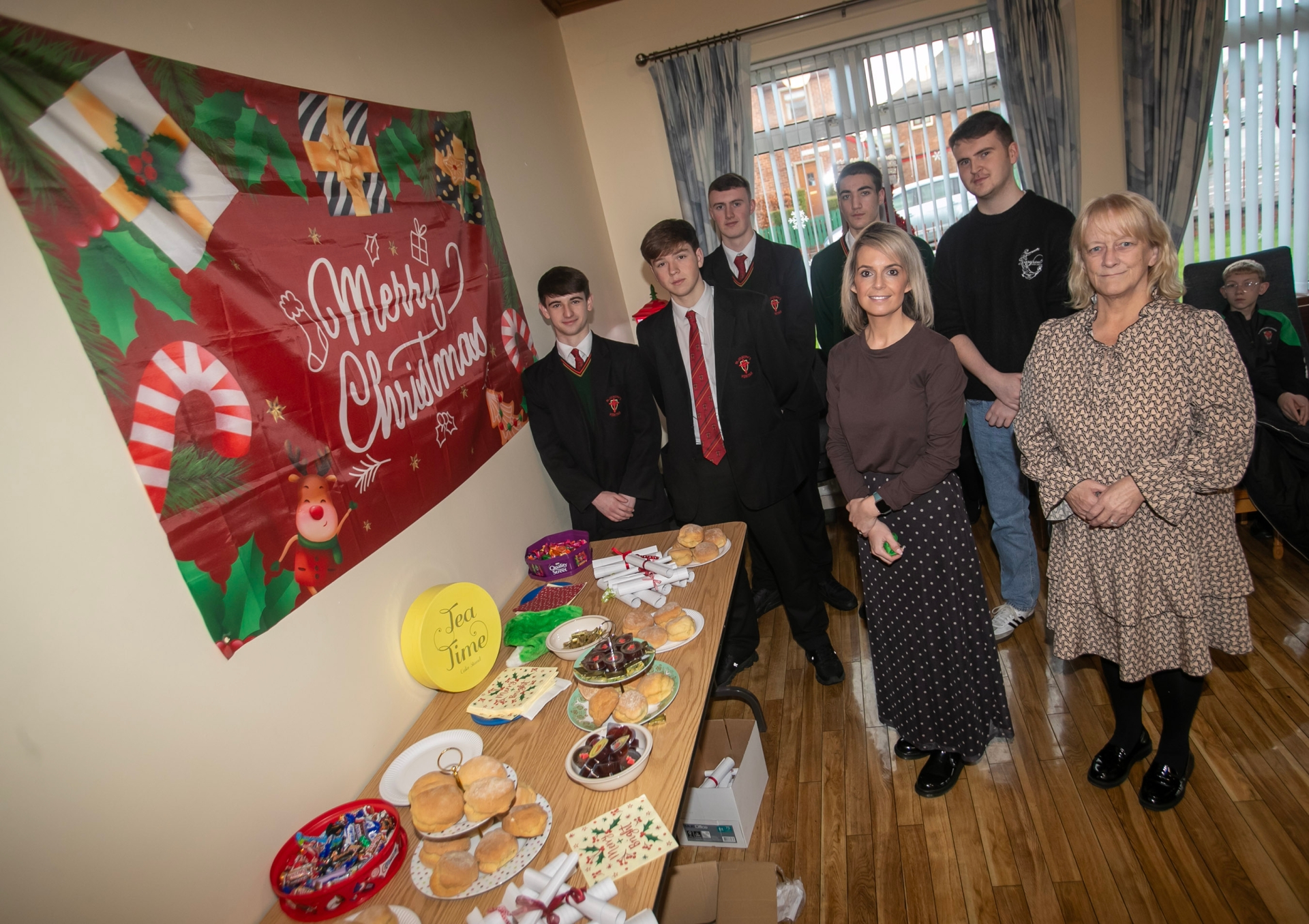 Mrs. Carla McCay, Head of English, St. Joseph's Boys School pictured with Mrs. Cathy McCallion, manager, Beechwood Court Residential Home, and students from the school, who presented 'letters' from pupils and seasonal refreshments to residents at the home on Friday morning. (Photos: Jim McCafferty Photography)