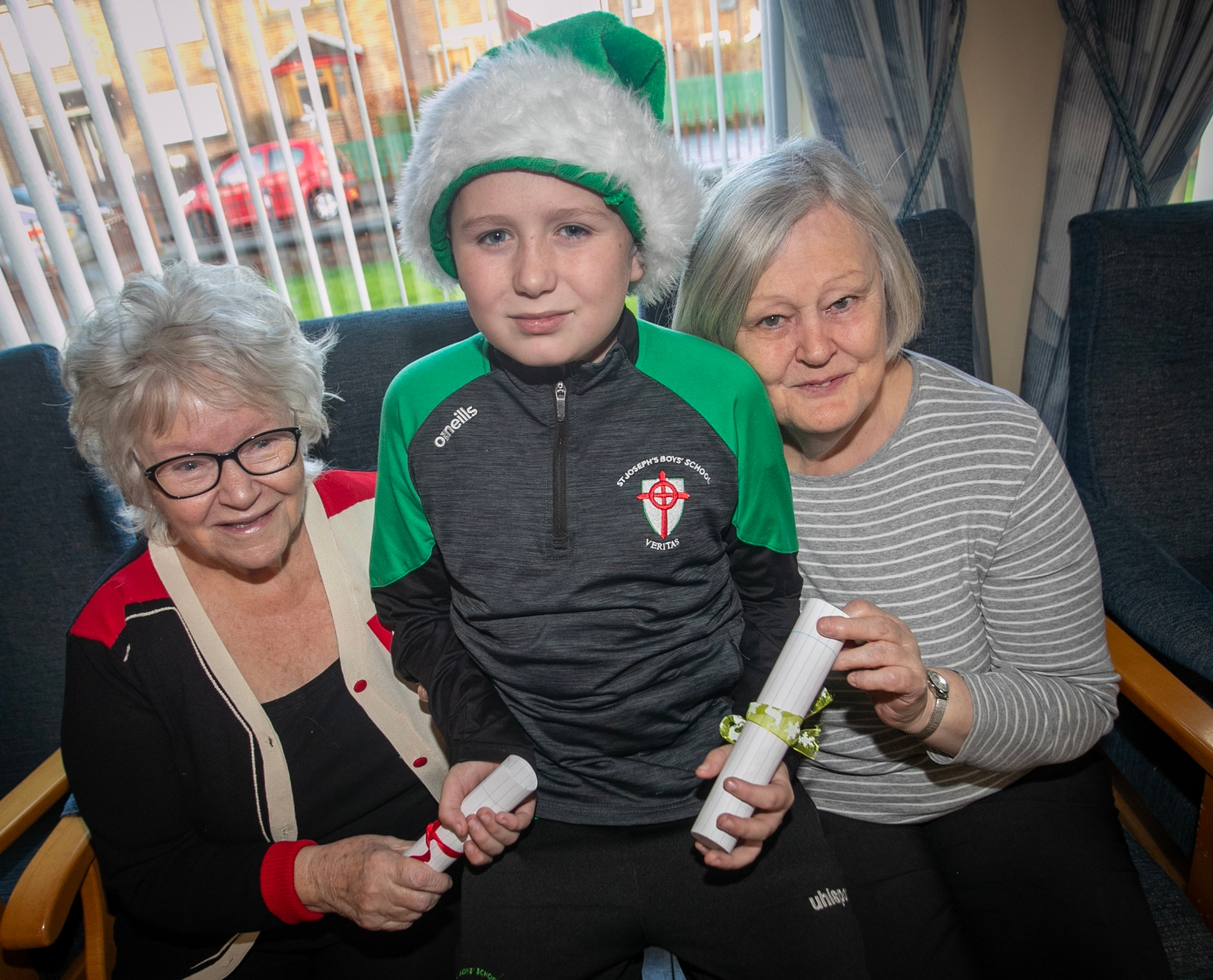 Harry Johnston giving 'Christmas Letters' from St. Joseph's Boys School students to Beechwood Court residents Kathleen McMonagle and Caroline McIvor.