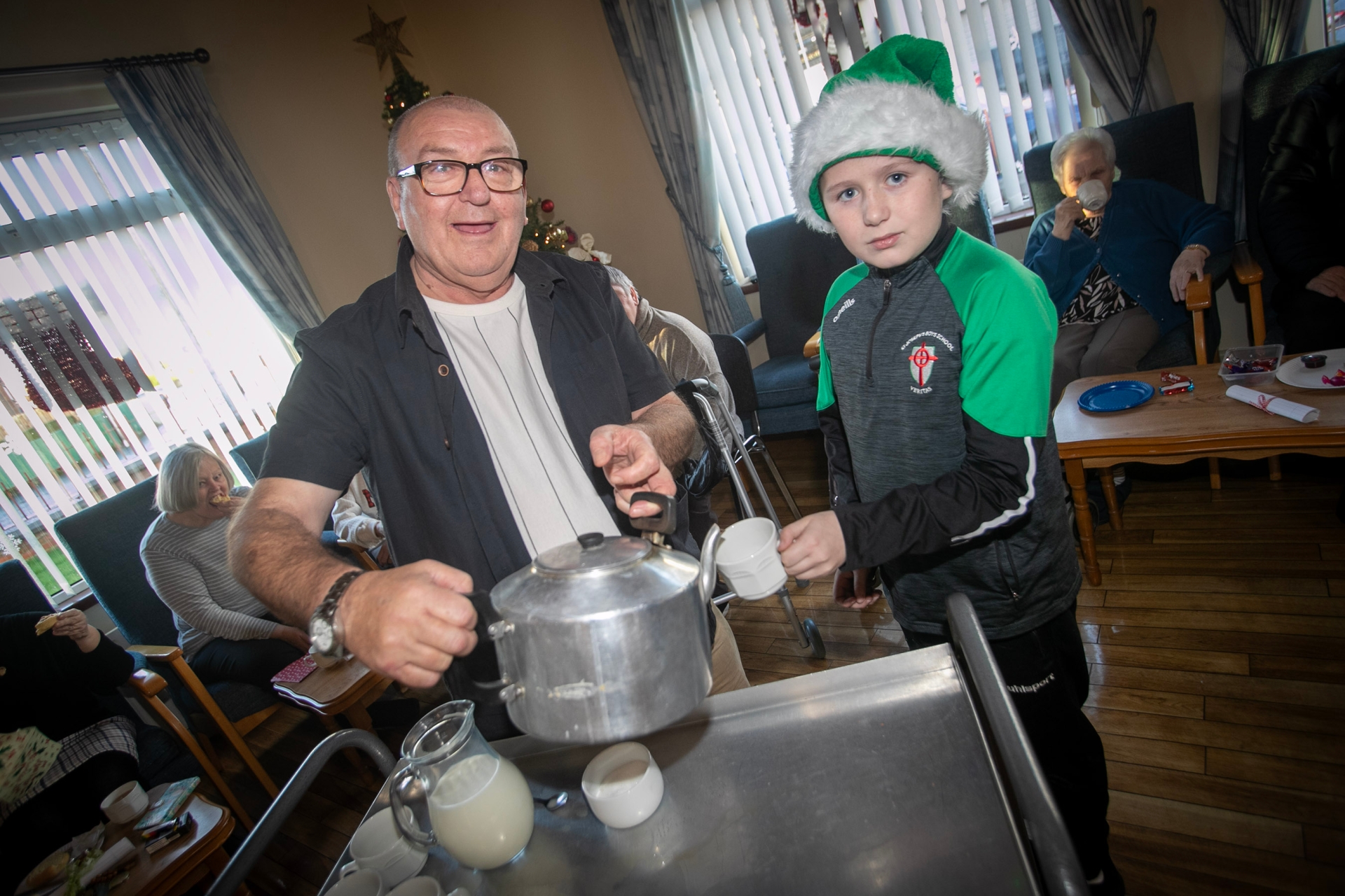 RECIPROCATION. . . .Beechwood Court resident Philip Wilson reciprocating the kind deed from St. Joseph's Boys School by pouring a cup of tea to Harry Johnston on Friday morning.
