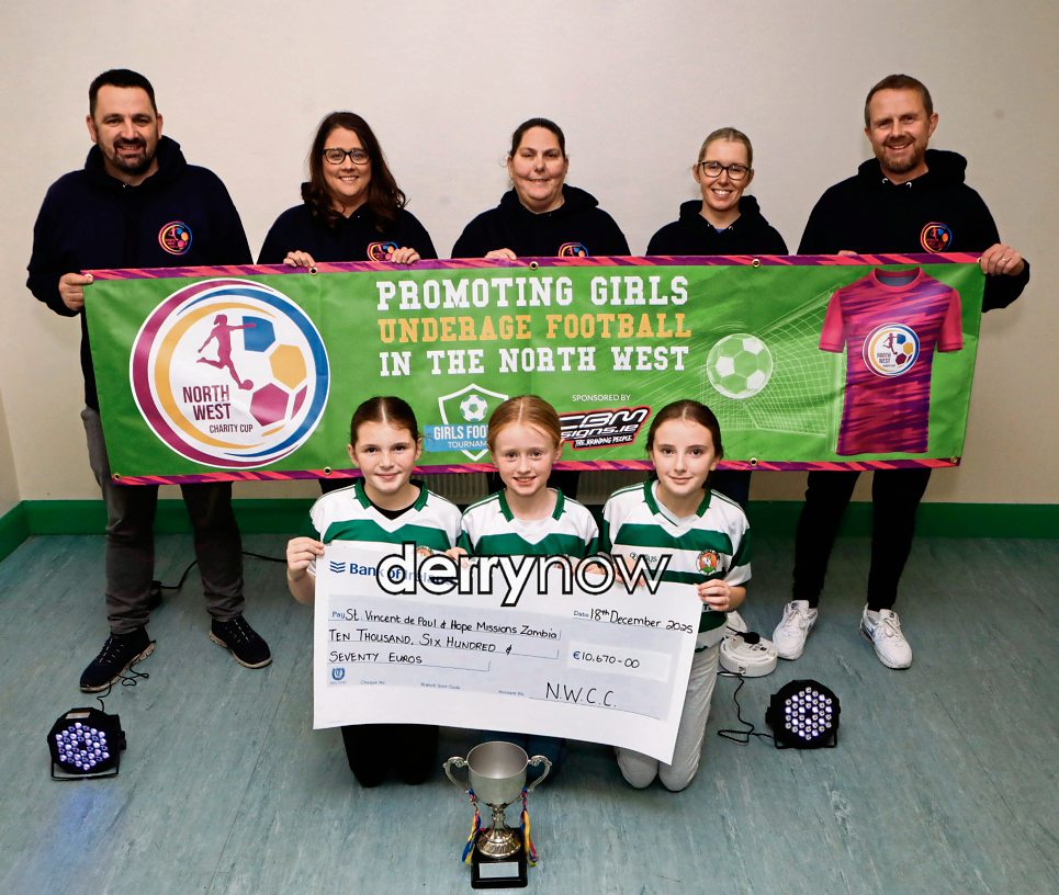 Brian Murray (standing on right) with from left, Kevin O'Donnell, Sara O'Doherty, Sharon Moore and Helen McGinley, organiser of the inaugural North-West Charity Cup promoting girls football in the north-west, cross-community and cross-border tournament held in Magee pitches, Duncreggan Road, which raised €10,670. Front are Megan McGinley, Loryn O'Doherty Ava Murray. (Photos - Tom Heaney, nwpresspics)