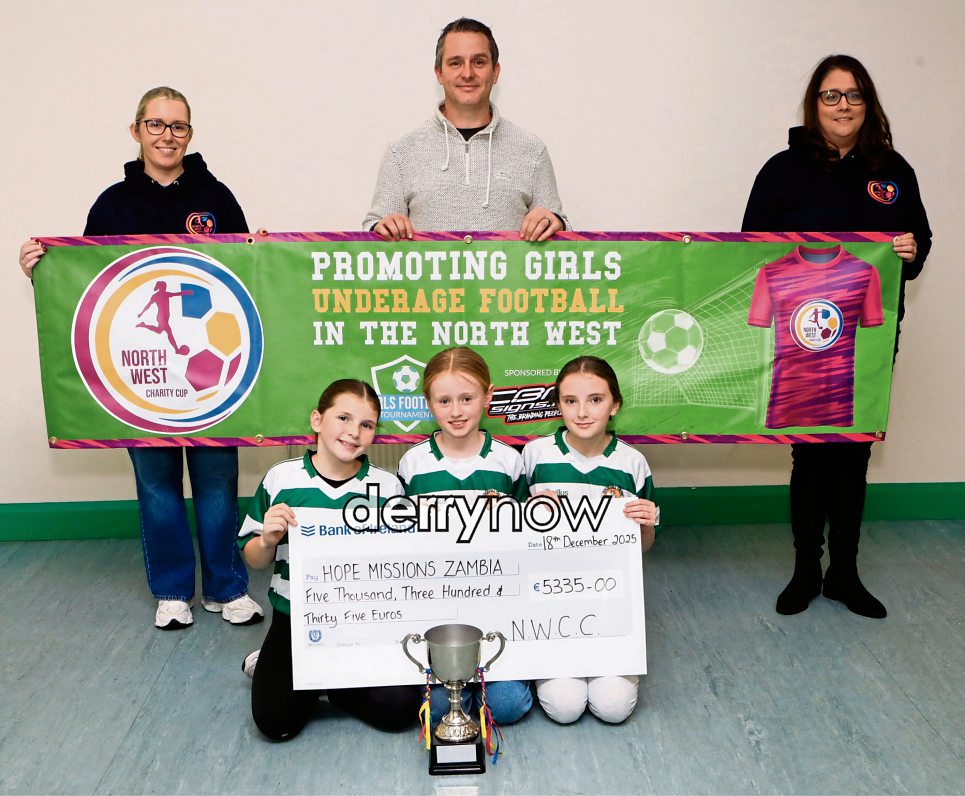 Gareth Hayes, Hope Missions Zambia being presented with a cheque for €5,335 proceeds from the inaugural North-West Charity Cup promoting girls football in the north-west, cross-community and cross-border tournament held in Magee pitches, Duncreggan Road, which raised a total amount of €10,670. Standing, are Sharon Moore and Helen McGinley. Front are Megan McGinley, Loryn O'Doherty Ava Murray.