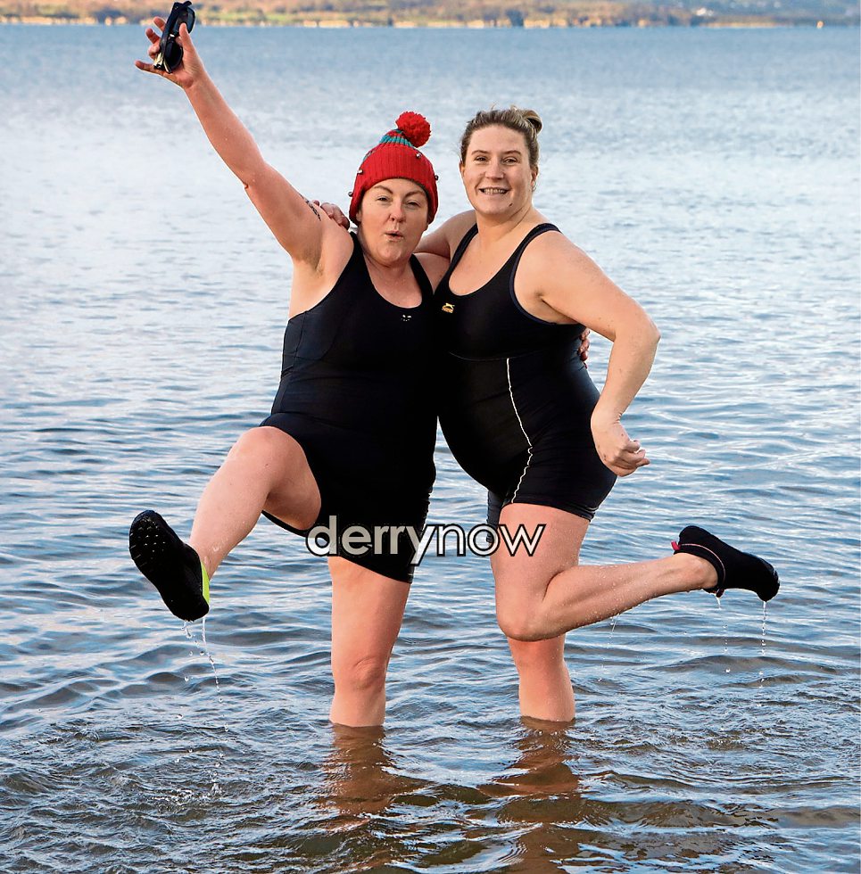 Emma and Alana pose for a photo at the Christmas Day swim at Ludden Beach.