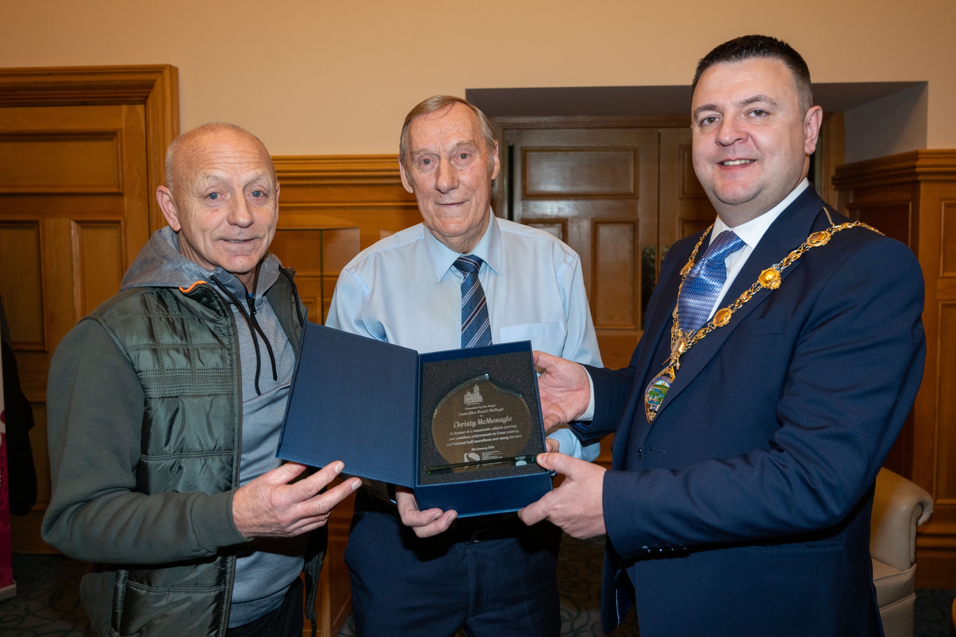 The Mayor Councillor Ruairi McHugh presented Christy McMonagle with a commemorative crystal plaque. Included is Christy's running mentor Liam McHugh who proposed the award.