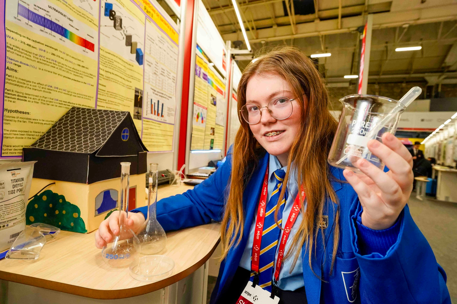St Mary's College student Aoife O Hagan with her project, 'Investigating the photocatalysis and antimicrobial ability of titanium dioxide using UVA , UVB and UVC Part II and building & testing a fan with TiO2 and UVA', at the 2026 Stripe Young Scientist and Technology Exhibition.